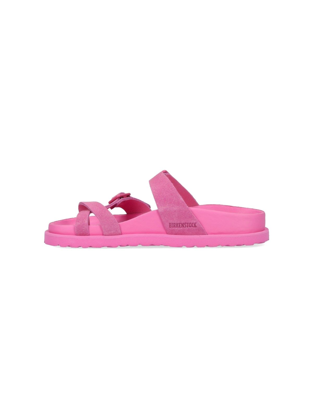 Sandali "Mayari" Birkenstock, in suede rosa, design infradito, punta tonda aperta, due fasce fibbia regolabili, logo impresso fibbia, lettering logo impresso laterale, suola in gomma.