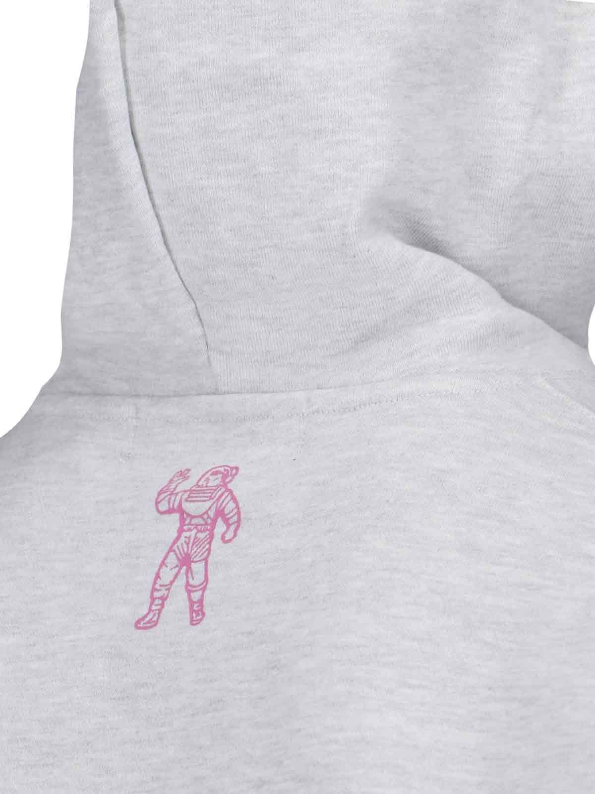 Felpa cappuccio "Tropical Crest Popover" Billionaire Boys Club, in cotone grigio, stampa logo multicolor petto, una maxi tasca fronte, logo nero manica, logo "Standing Astronaut" rosa retro, finiture a costine, orlo dritto.