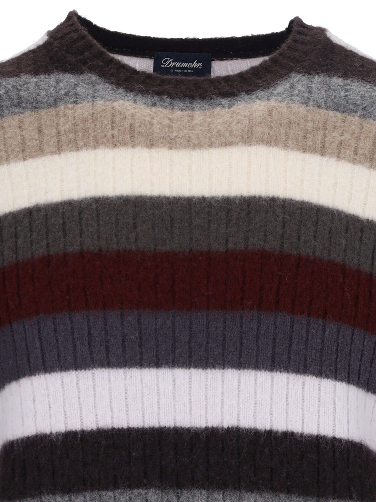 Maglia a righe Drumhor, in lana multicolor, design a coste, motivo a righe, girocollo, orlo dritto.