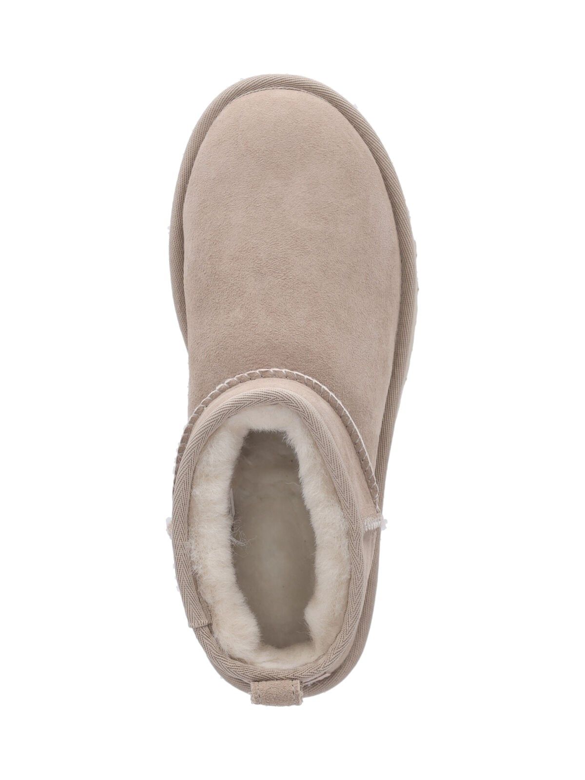 Stivaletti "Classic Ultra Mini" Ugg, in suede panna, punta tonda, etichetta logo retro, linguetta tab retro, vestibilità slip-on, fodera in shearling bianco, suola in gomma.