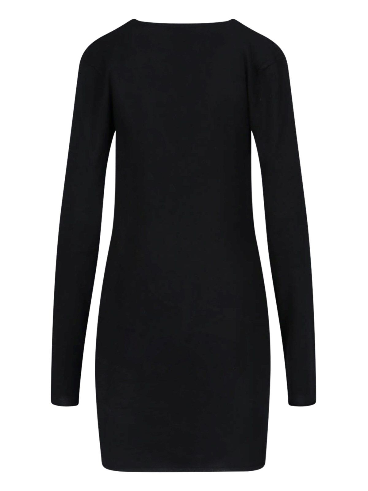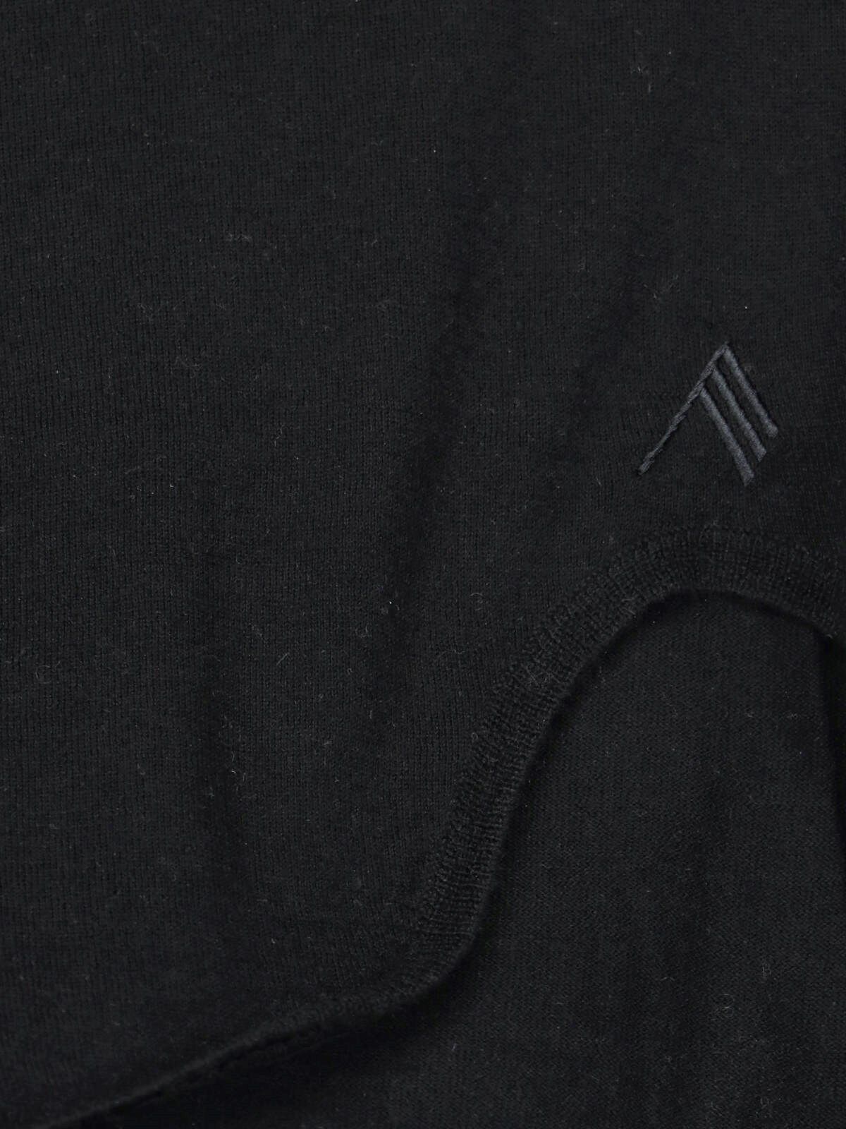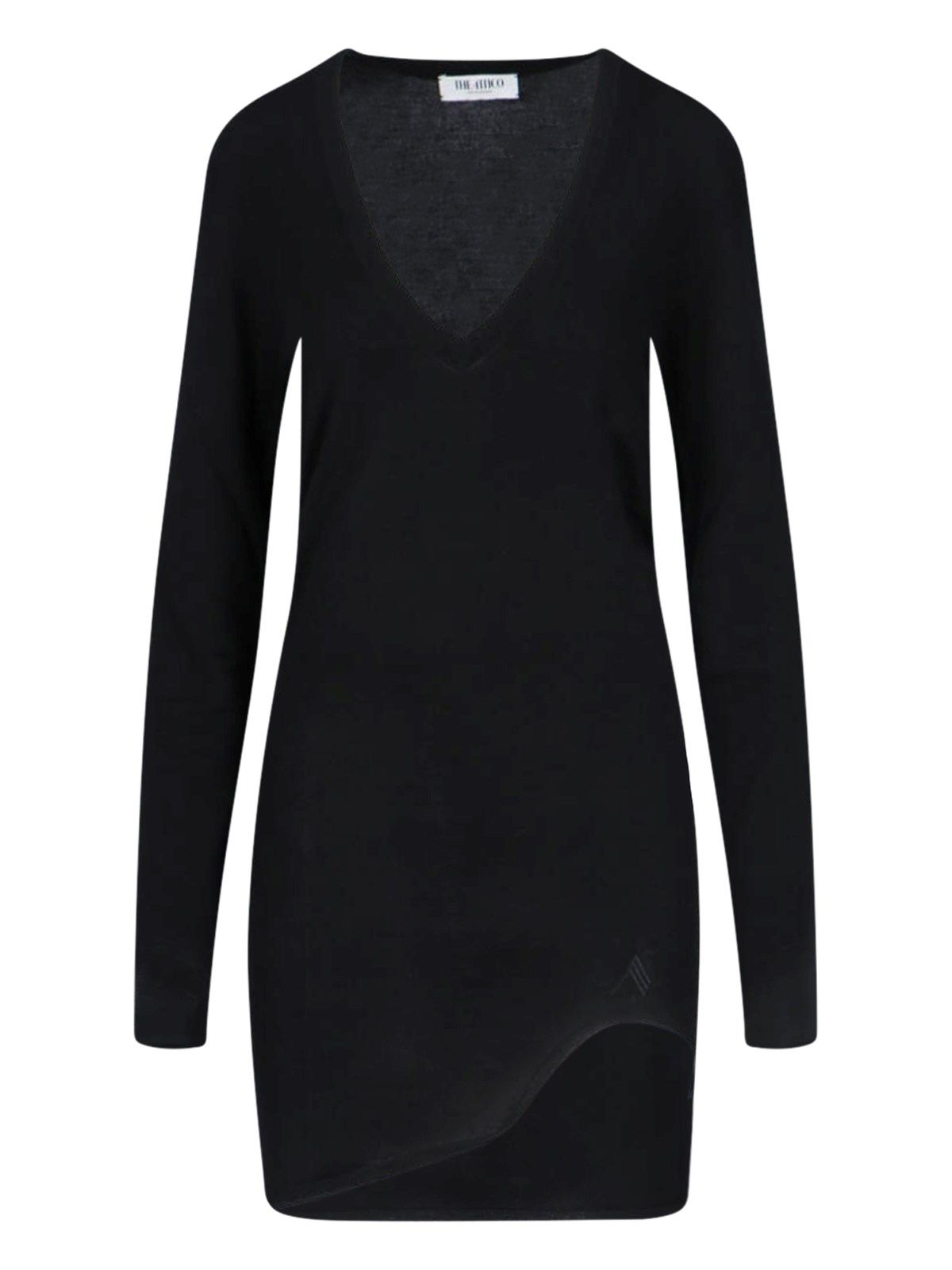 Abito mini asimmetrico The Attico, in cashmere e seta neri, scollo a V, spacco laterale, dettaglio ricamo logo tono su tono, taglio vivo su fondo, orlo asimmetrico.