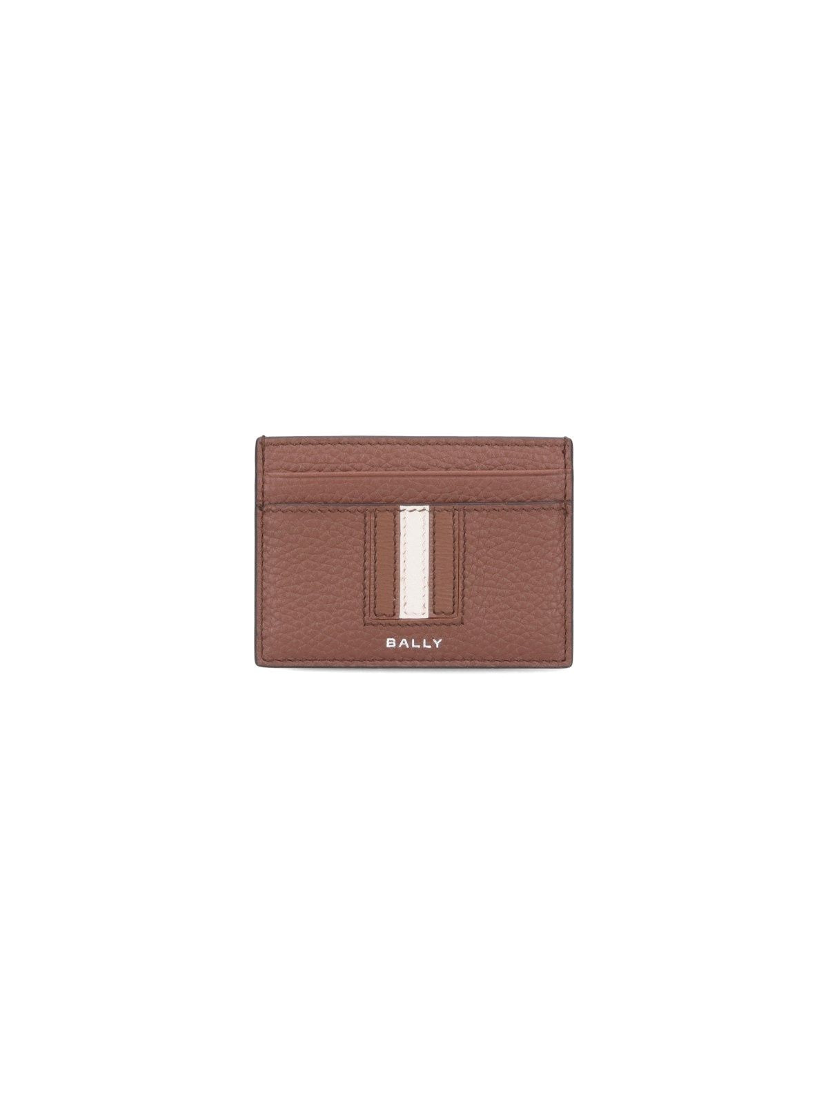 Portacarte "Ribbon" Bally, in pelle zigrinata marrone, dettaglio iconica "Bally Stripe" bianca e marrone fronte, logo metallico argentato fronte, una tasca piatta centrale, quattro slot carte.