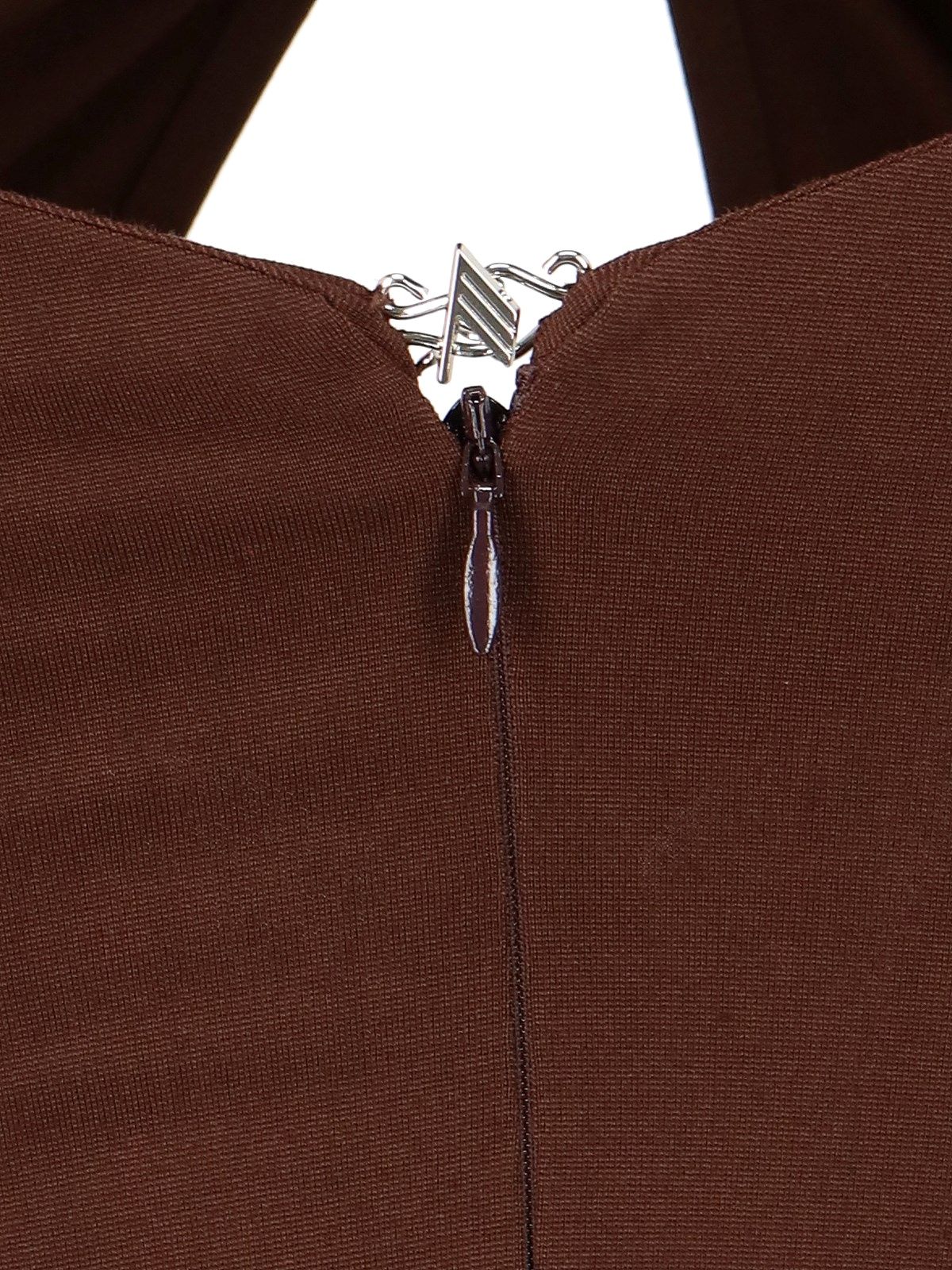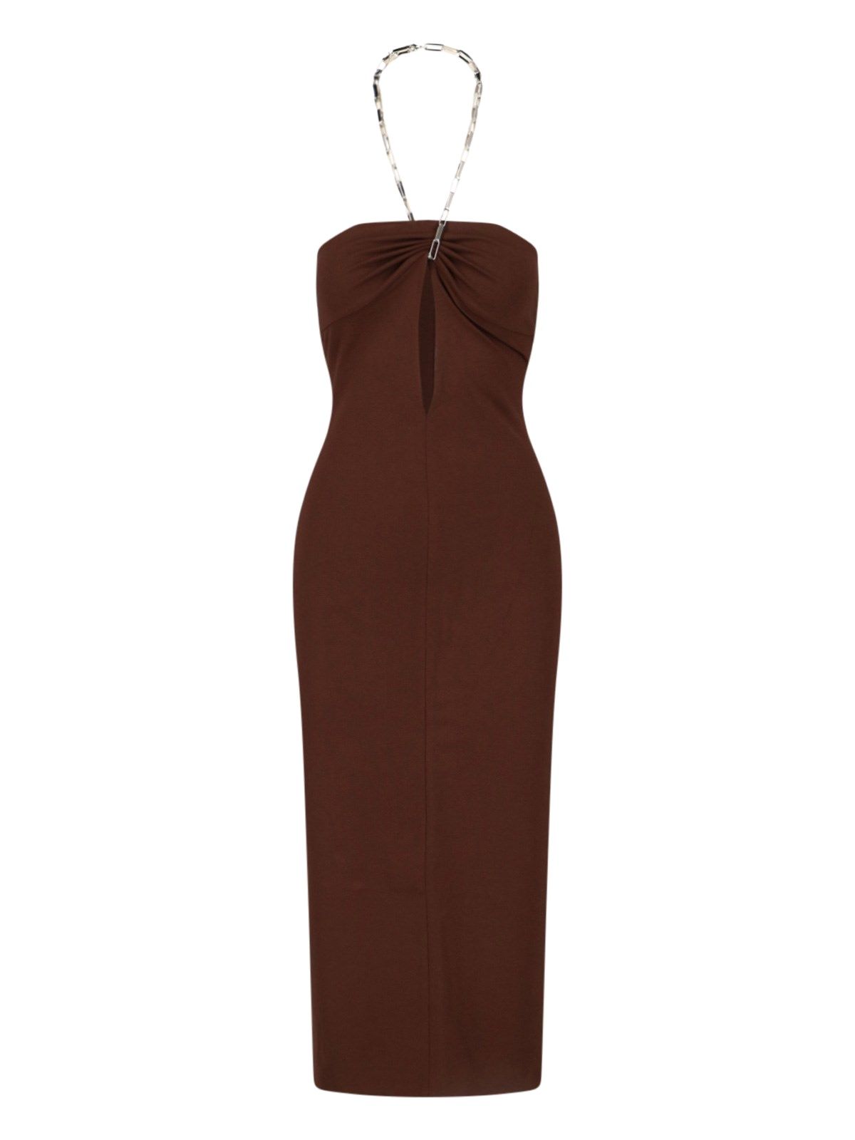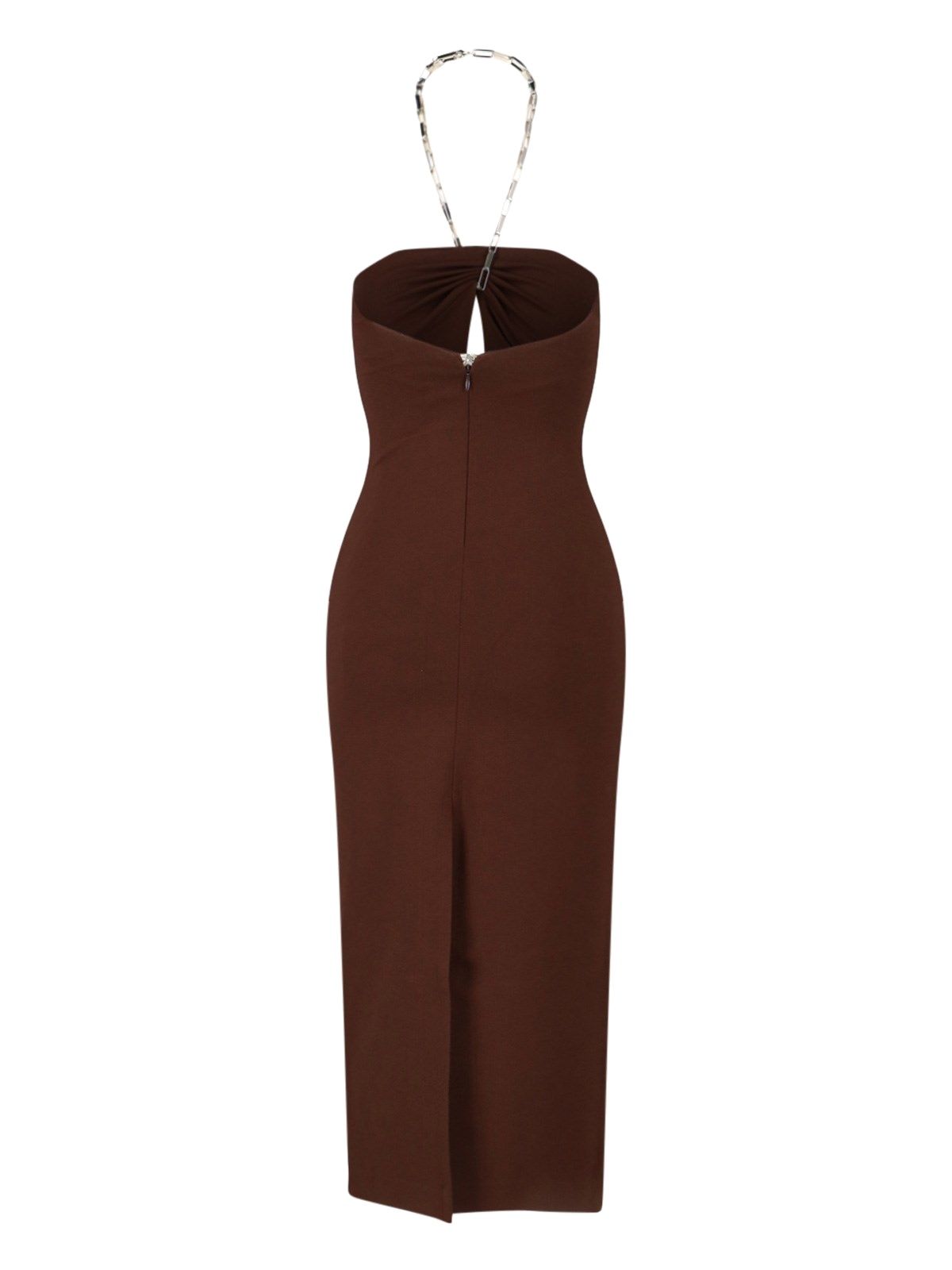 Abito dettaglio catena The Attico, in tessuto marrone, senza maniche, catena argentata rimovibile, senza maniche, dettaglio cut out anteriore, chiusura zip retro, spacco centrale retro, orlo dritto.