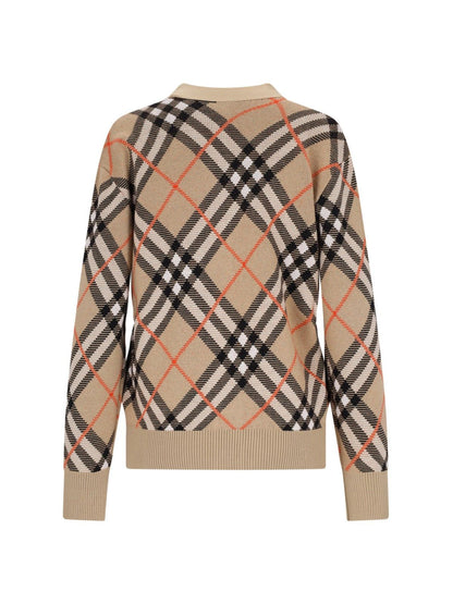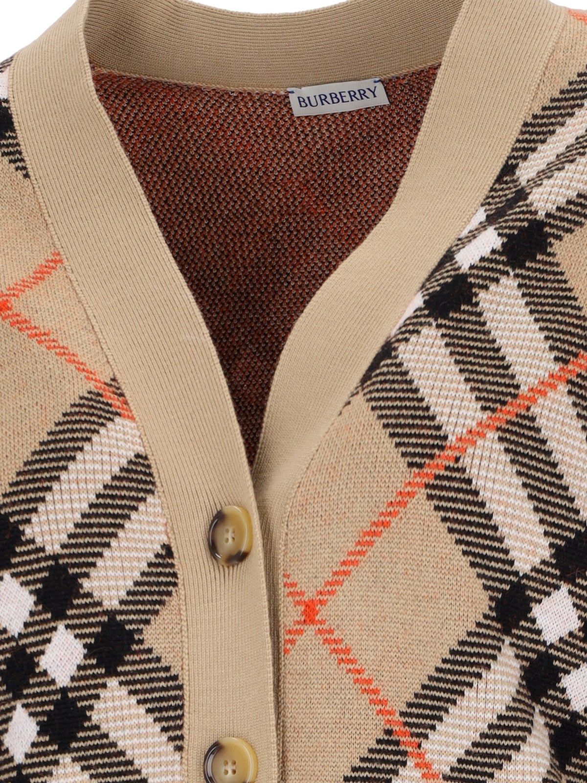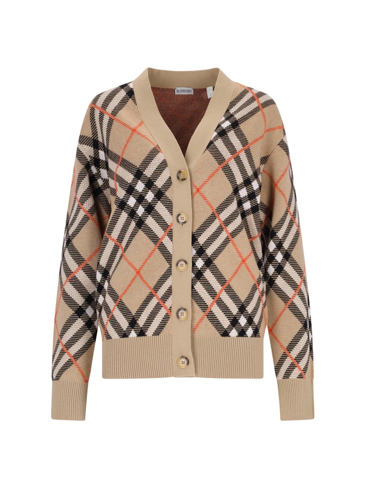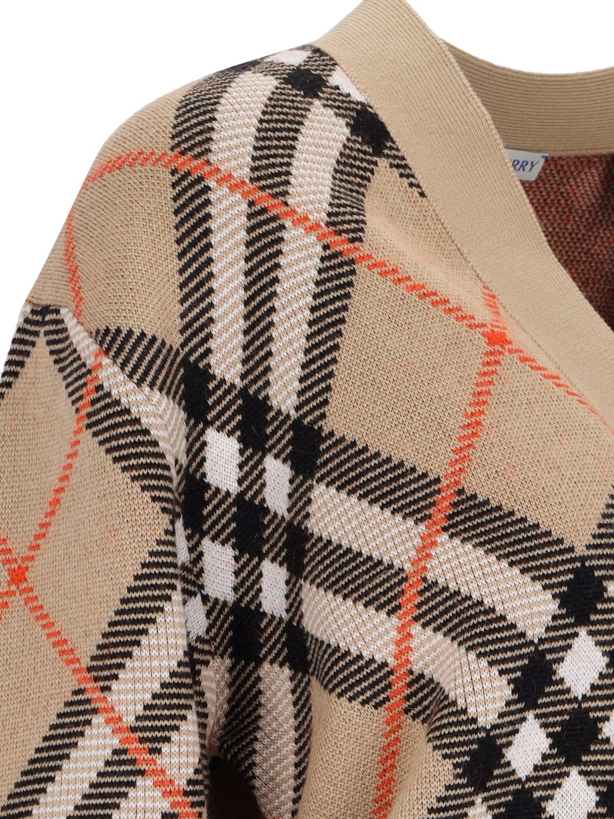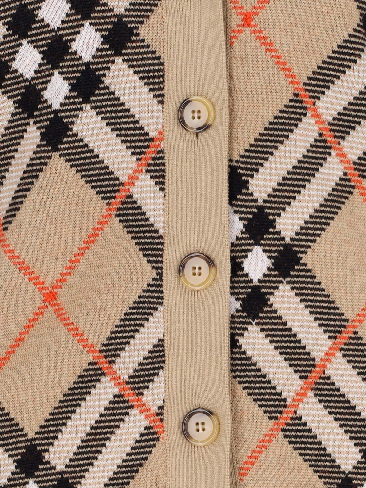 Cardigan in misto lana "Check" Burberry, in colore beige, motivo jacquard iconico all-over, scollo a V, chiusura bottoni, finiture a coste, orlo dritto.