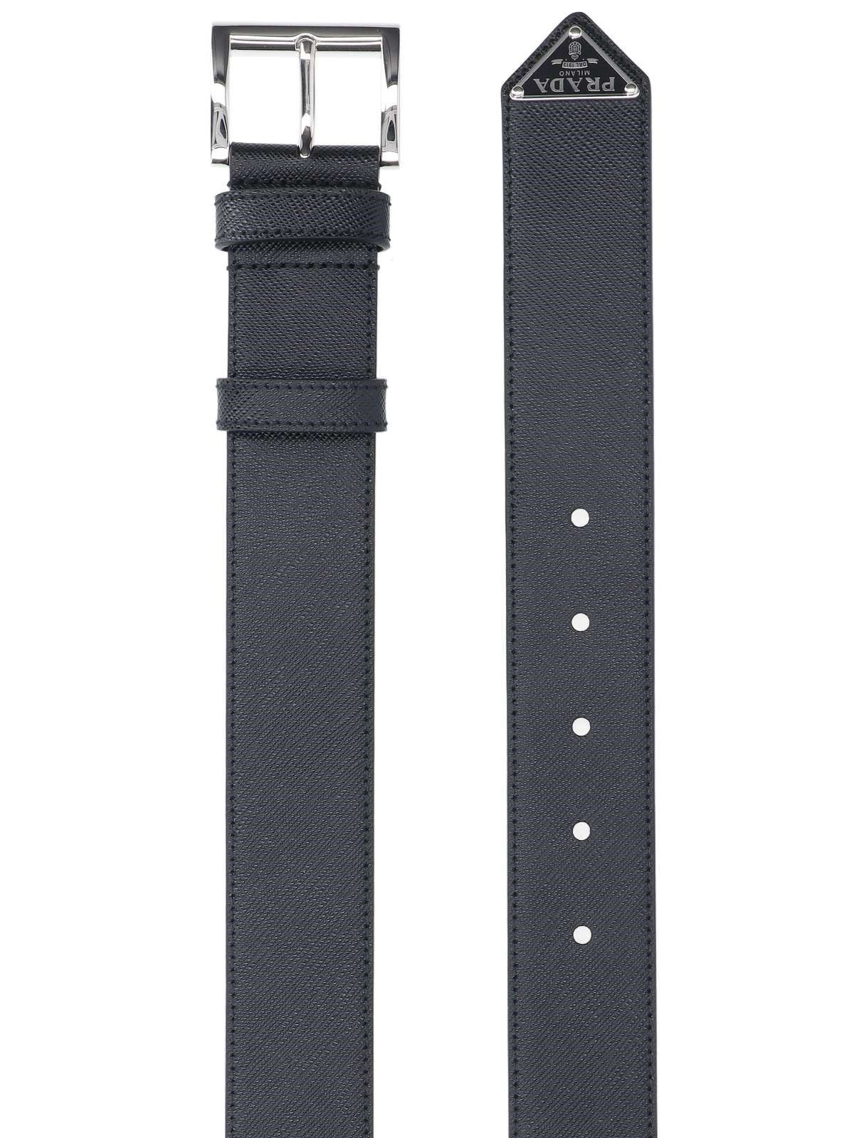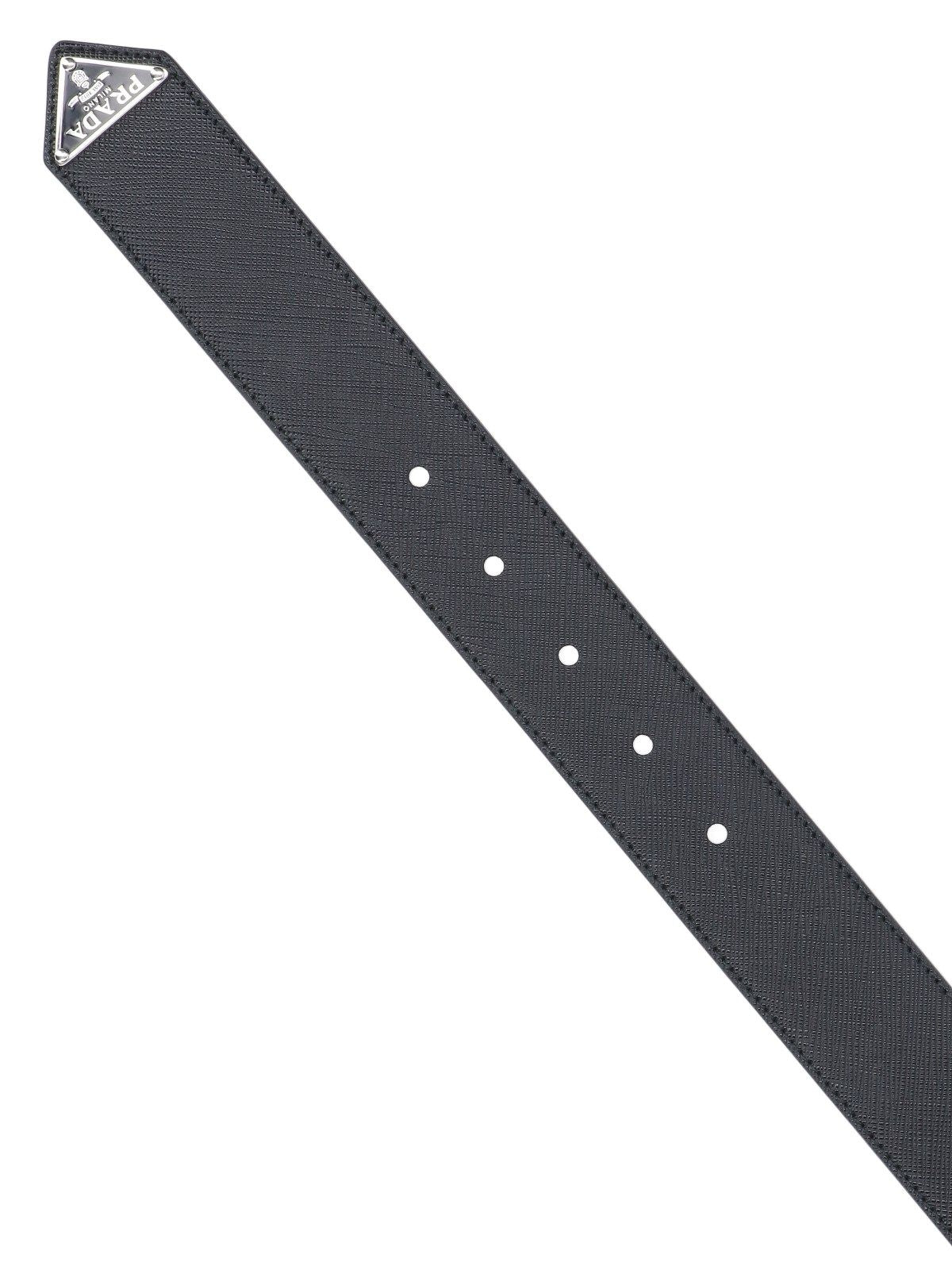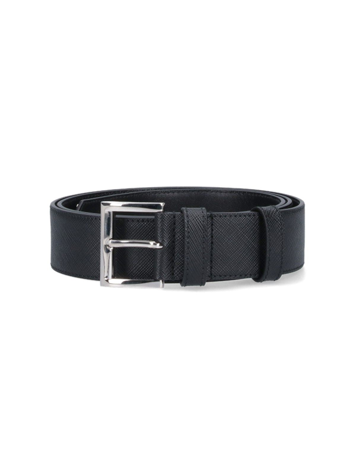 Cintura in Saffiano Prada, nera, fibbia in metallo argentato, logo triangolo in metallo smaltato fronte, regolabile.