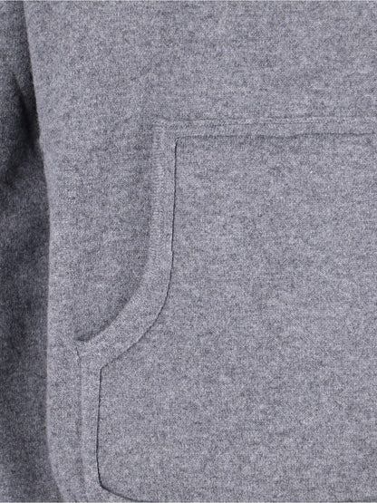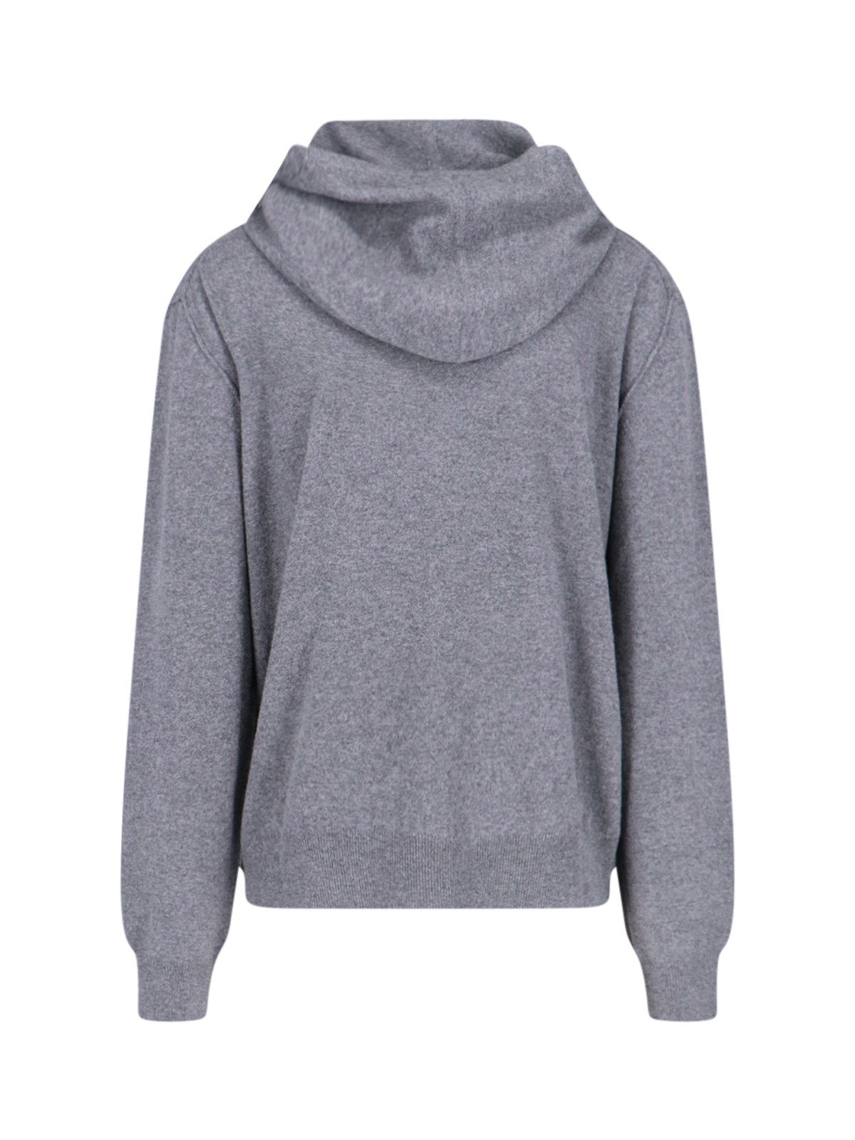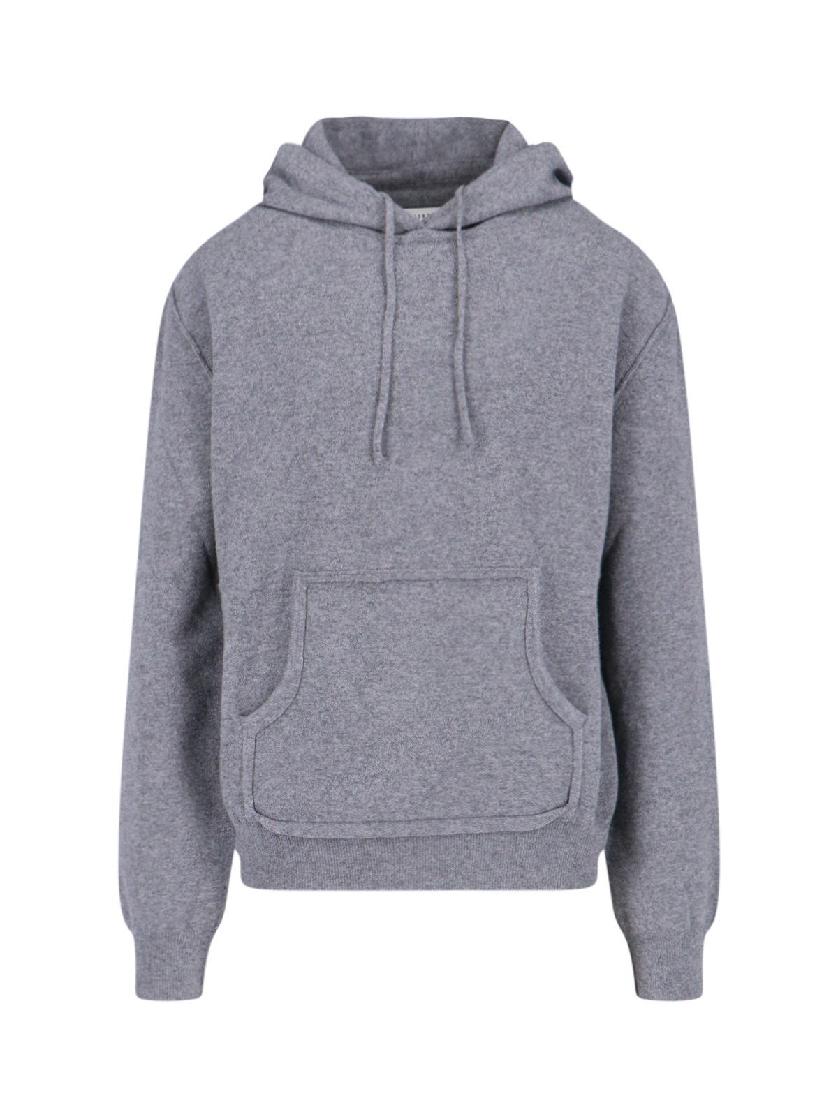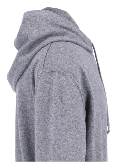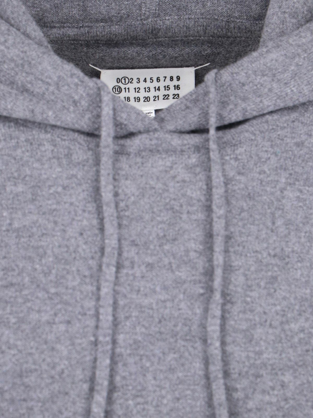 Felpa cappuccio in maglia Maison Margiela, in lana e cashmere grigi, cappuccio coulisse, una maxi tasca fronte, "Four Stiches" bianchi retro, finiture a costine, orlo dritto.
