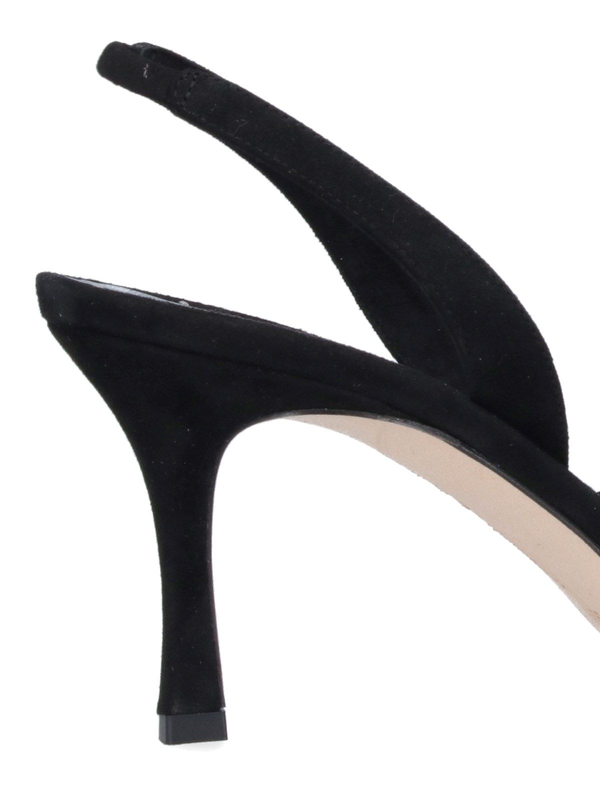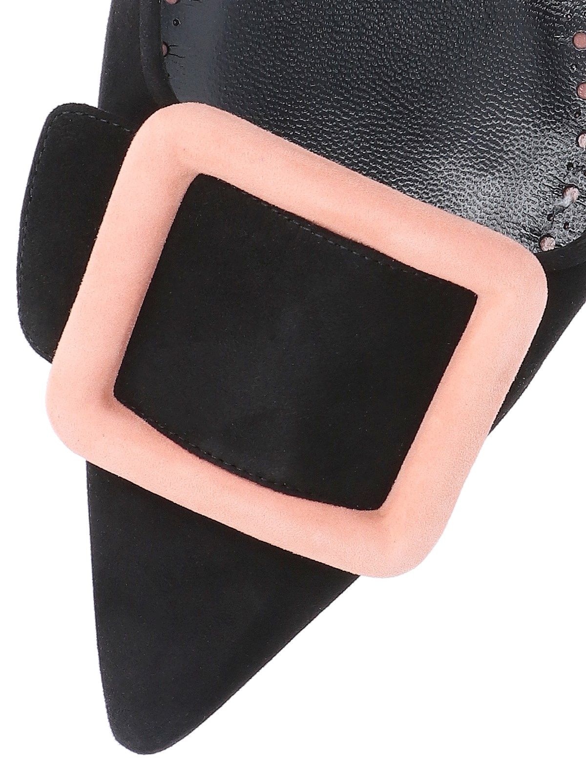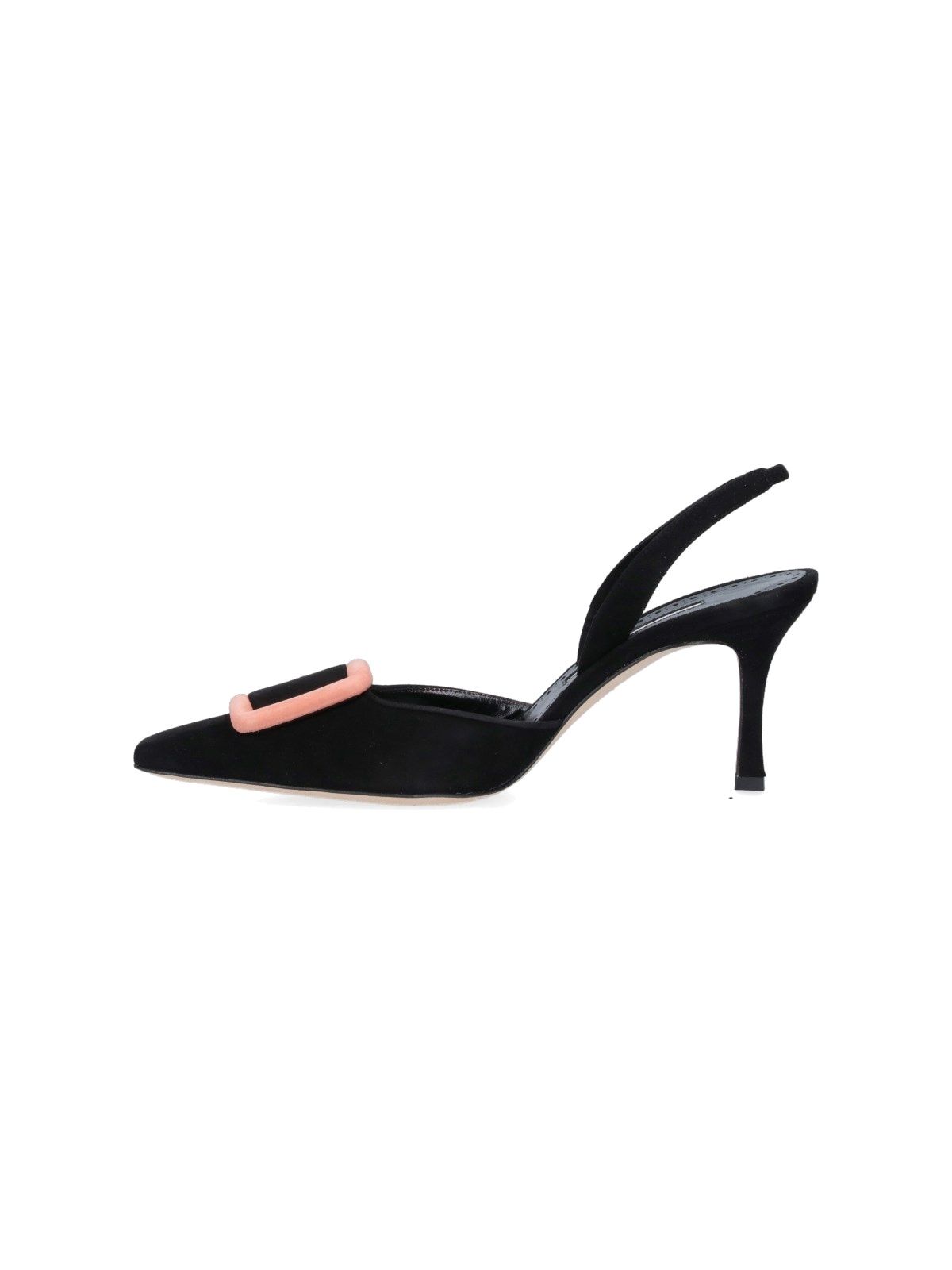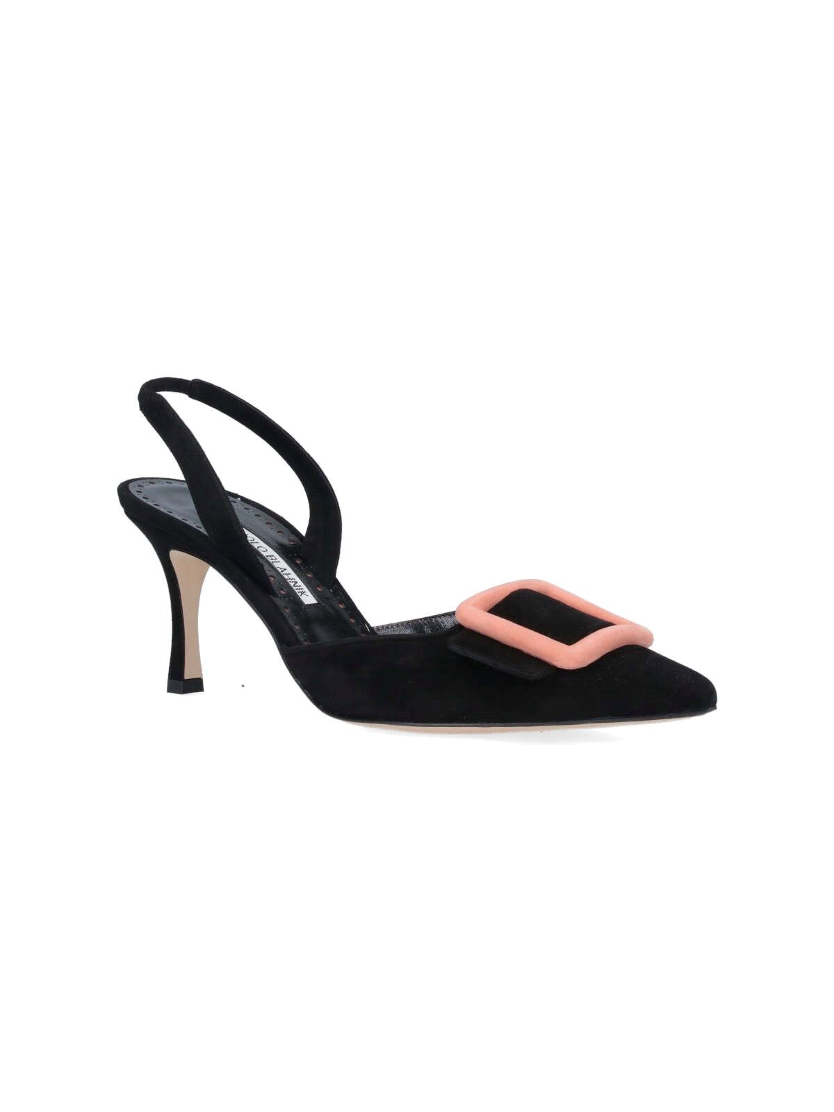 Decolleté "Maysli" Manolo Blahnik, in suede nera, a punta, dettaglio maxi fibbia rosa fronte, cinturino caviglia, tacco a stiletto, suola in cuoio.