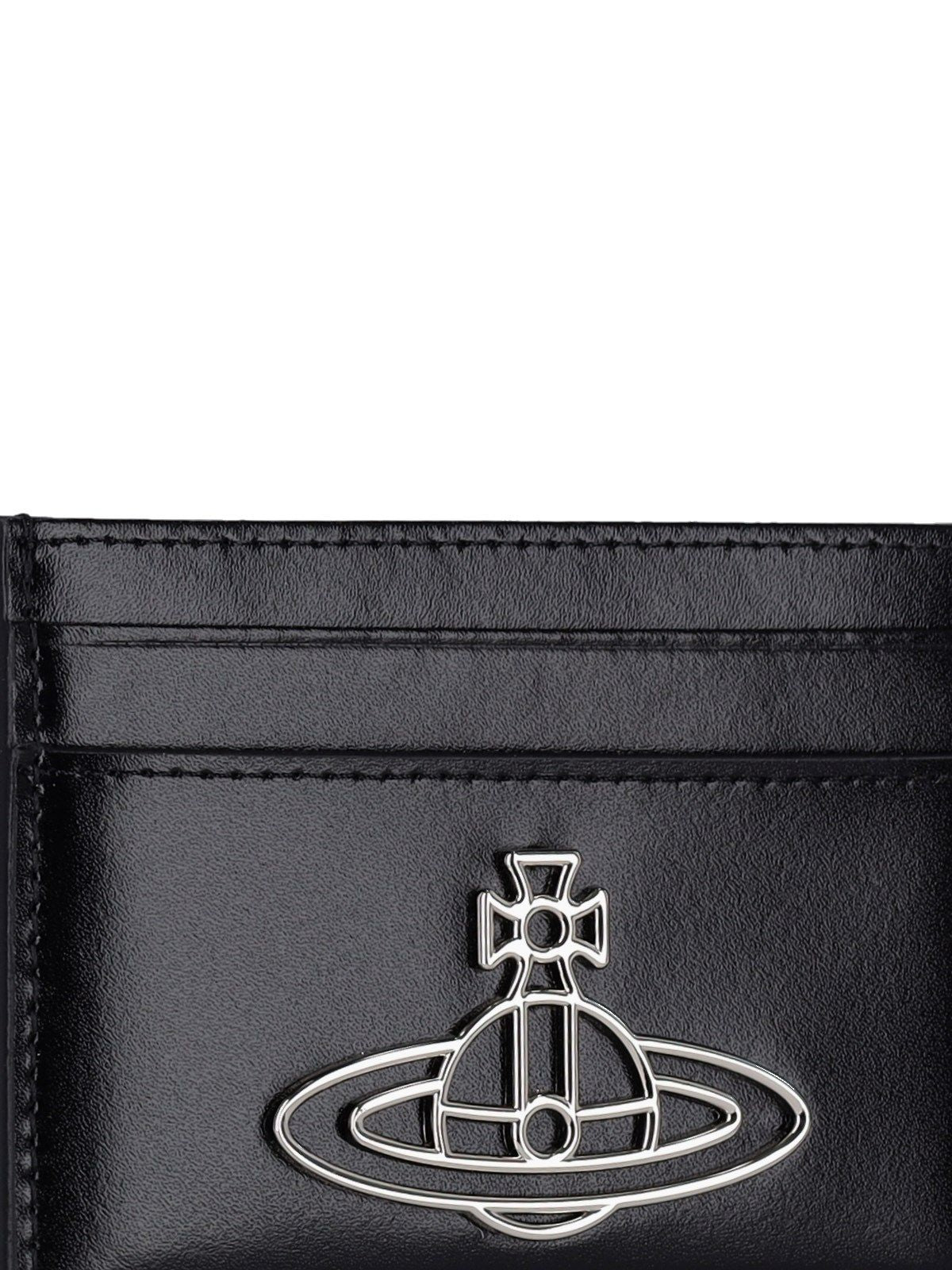 Portacarte logo Vivienne Westwood, in pelle martellata nera, logo Orb metallico argentato fronte, quattro slot carte fronte retro, una tasca piatta centrale.