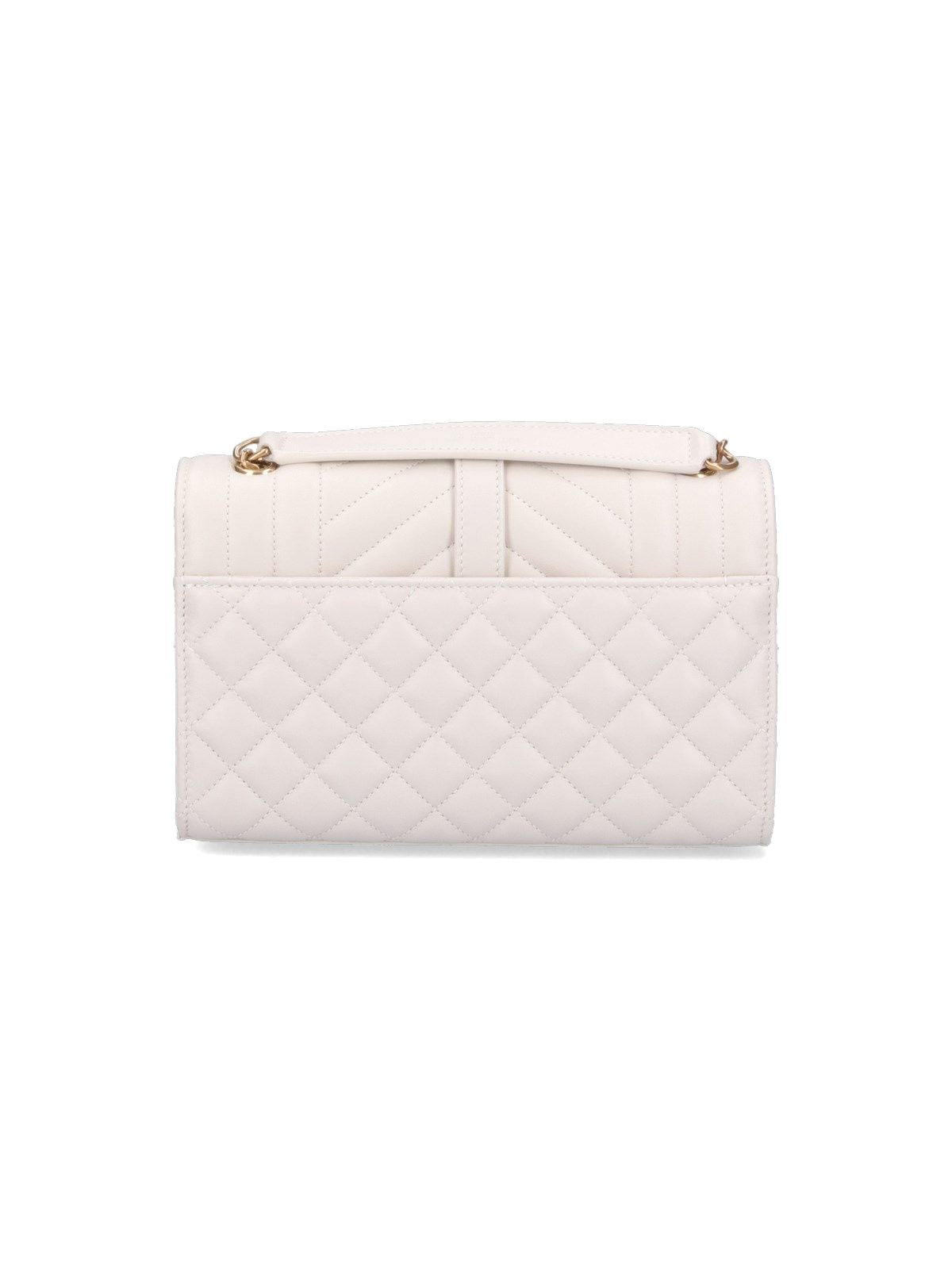Borsa tracolla piccola "Envelope", in pelle trapuntata panna, tracolla dettaglio catena, chiusura magnetica, logo metallico oro e argento fronte, un tasca piatta retro, una tasca piatta interna, scomparto interno principale.
