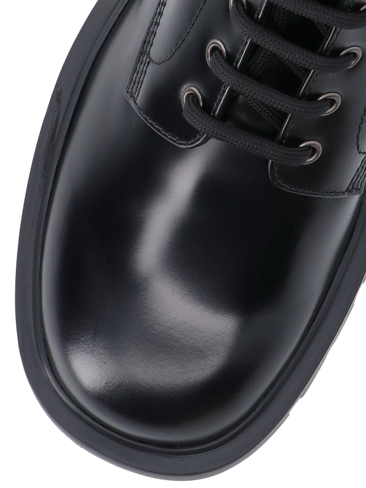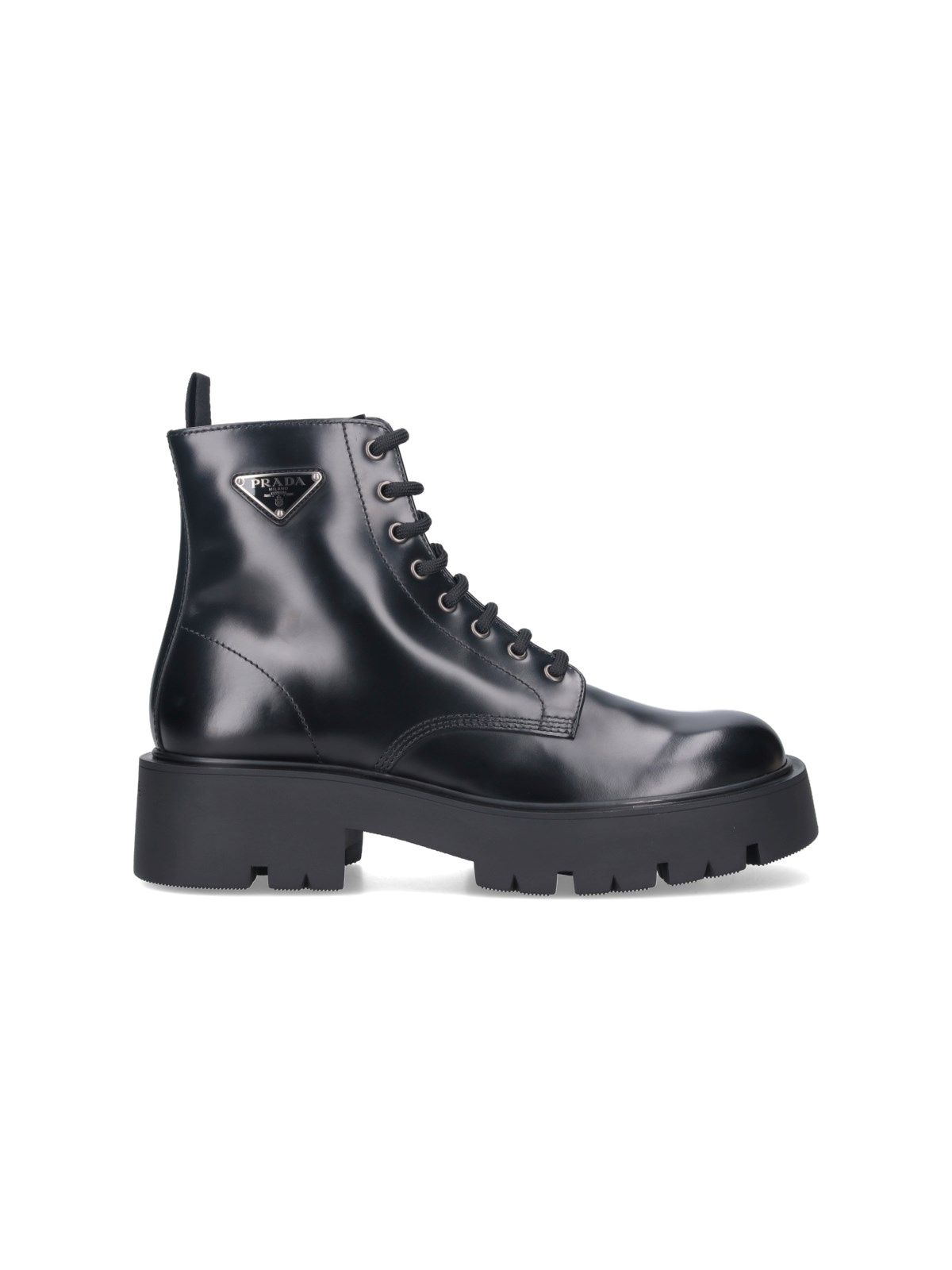 Stivaletti in pelle spazzolata prada, neri, punta tonda, chiusura lacci, dettaglio logo in metallo e smalto applicato laterale, linguetta retro, suola in gomma.