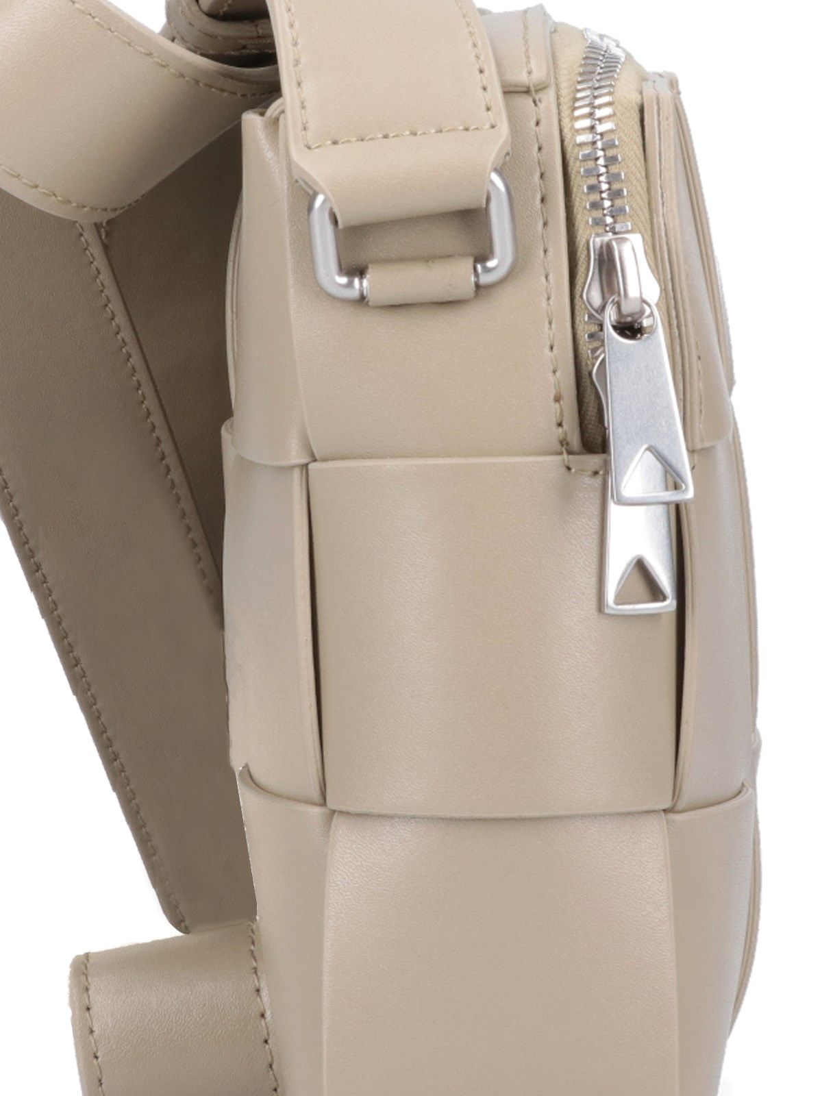 Borsa A Spalla "Cassette" Bottega Veneta, in pelle taupe, motivo intrecciato, tracolla regolabile, chiusura zip, uno scomparto interno.