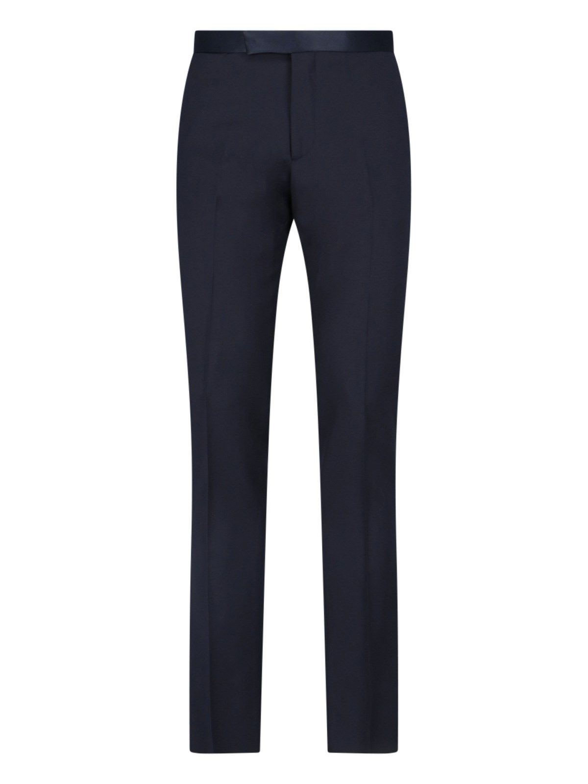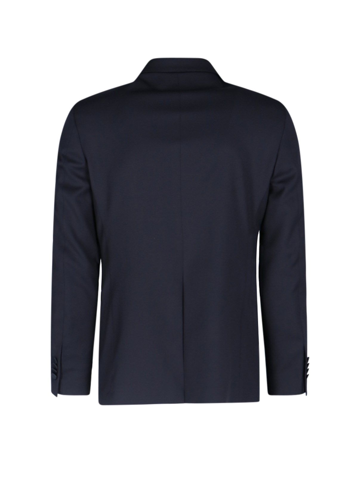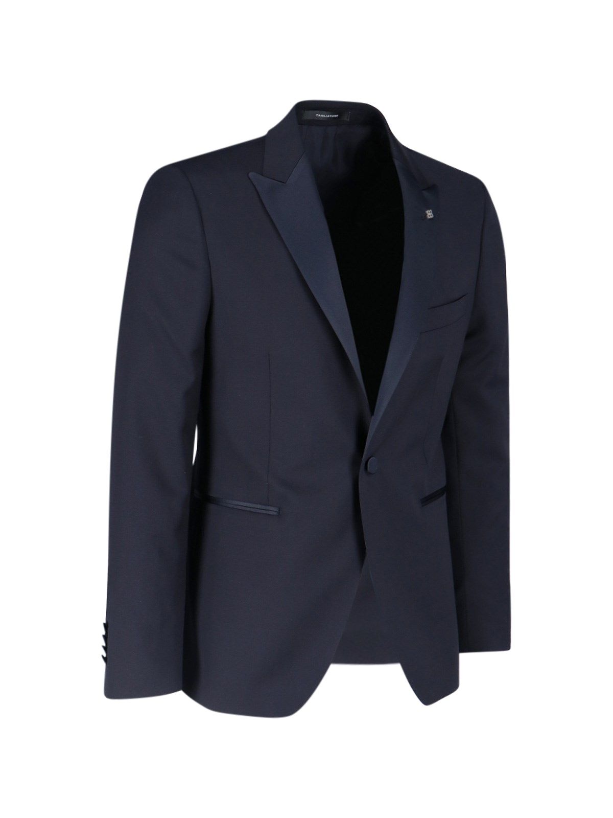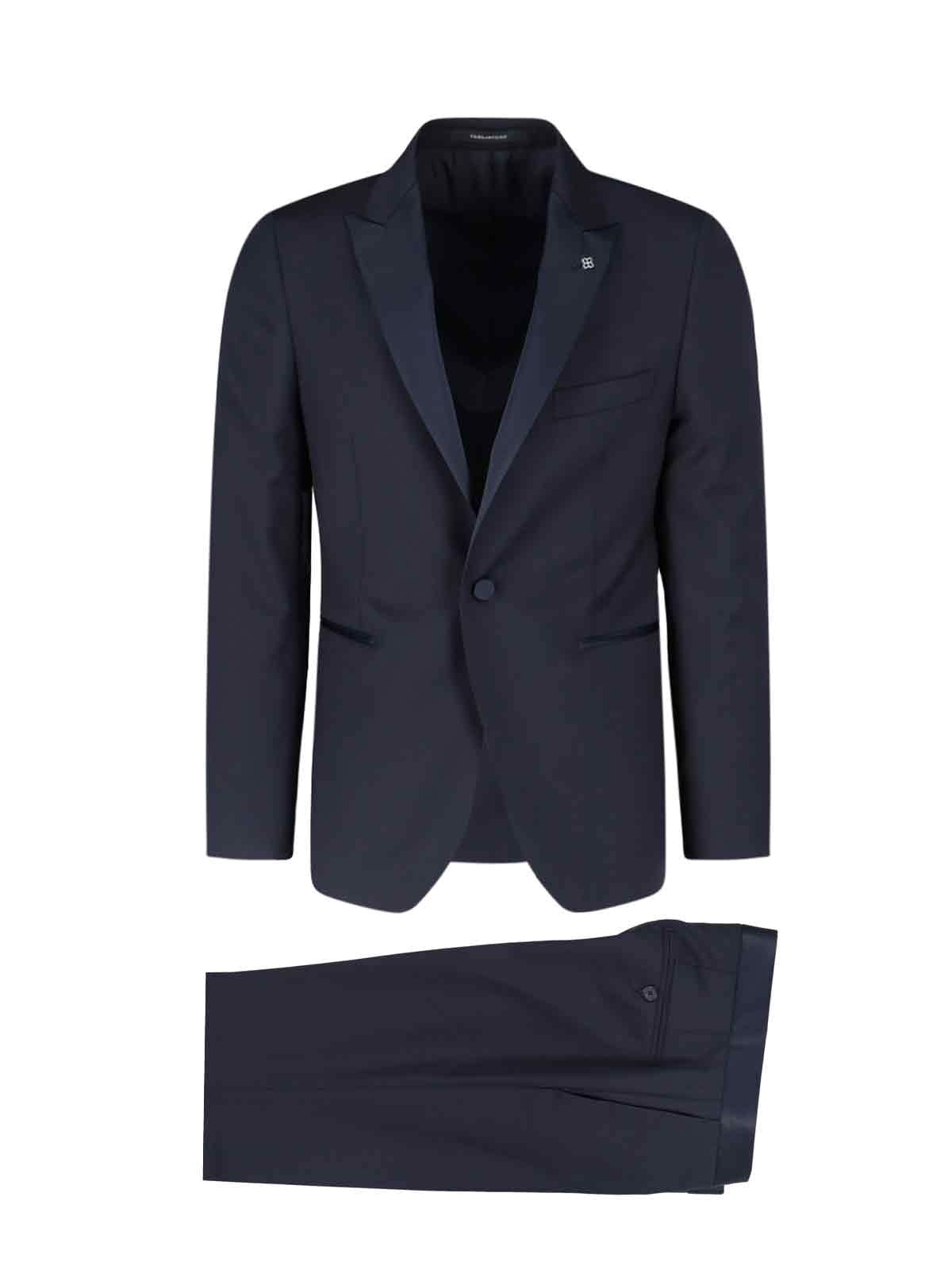 Completo Monopetto Tagliatore - realizzato esclusivamente per Sugar - in lana blu, dettagli satinati, revers a lancia dettaglio logo, taschino petto, chiusura bottone, due tasche a filetto laterali, bottoni polsini, pantaloni sartoriali, chiusura gancio e zip, pinces centrali, due tasche a filetto retro, orlo dritto.