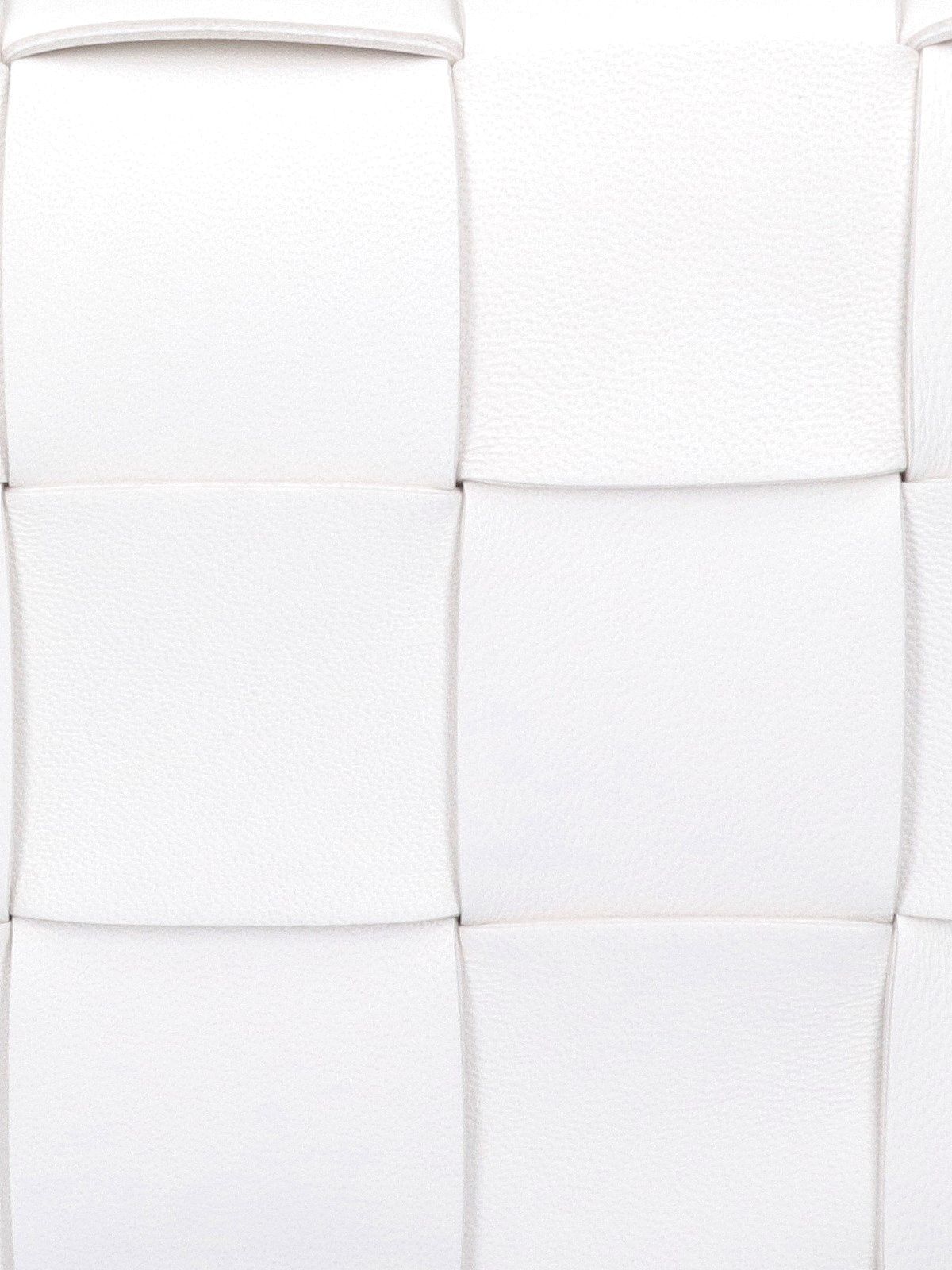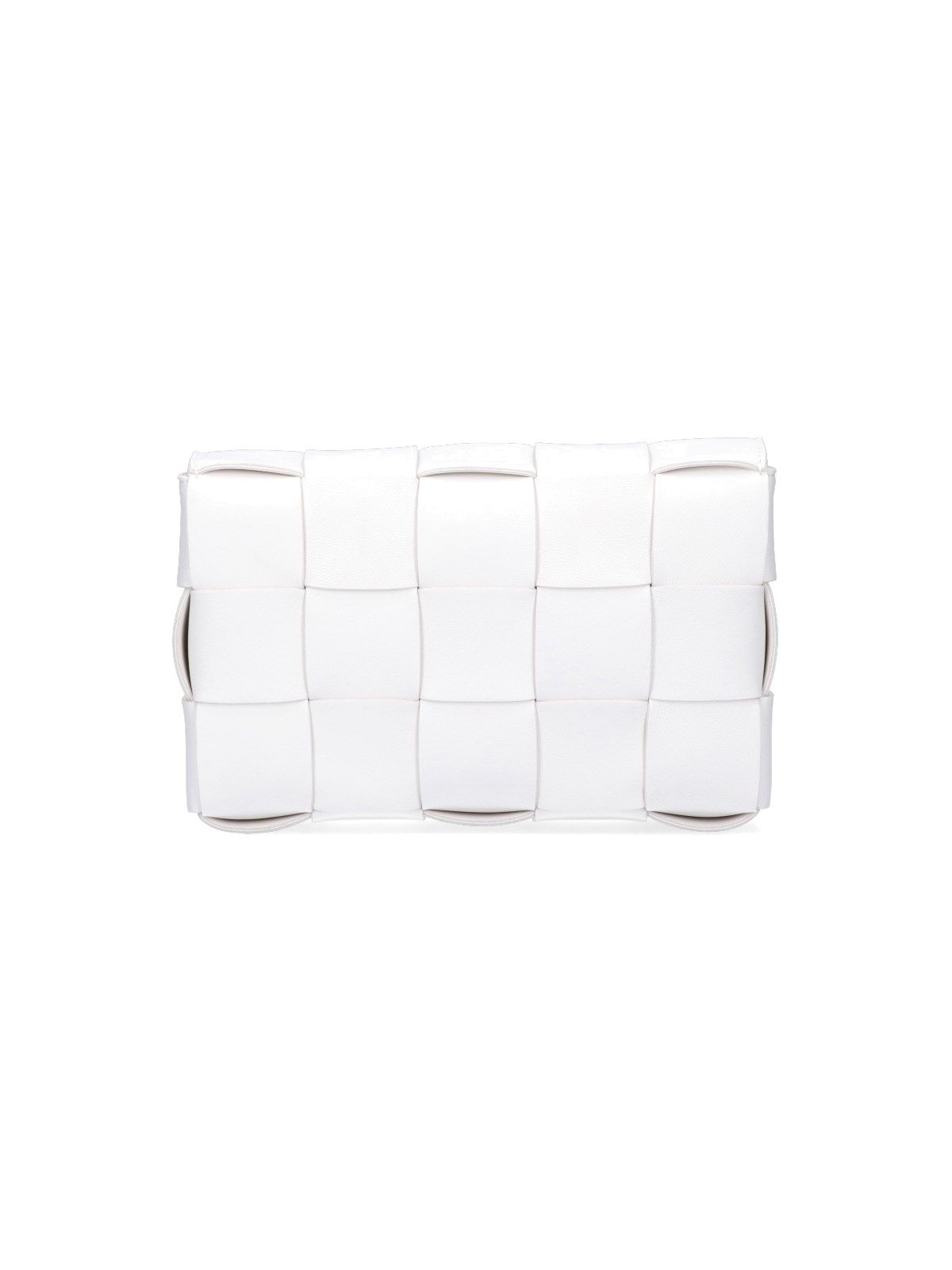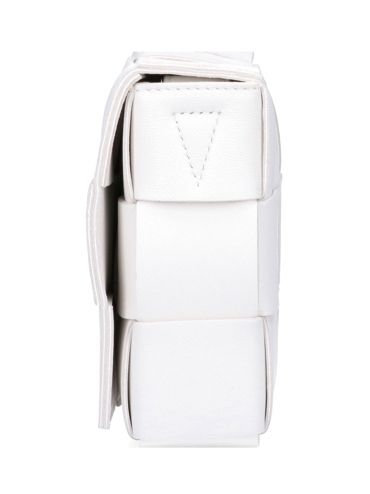 Borsa tracolla "Cassette" Bottega Veneta, in pelle bianca, motivo intrecciato iconico, tracolla regolabile, chiusura bottone magnetico, una tasca zip interna, uno scomparto interno principale.