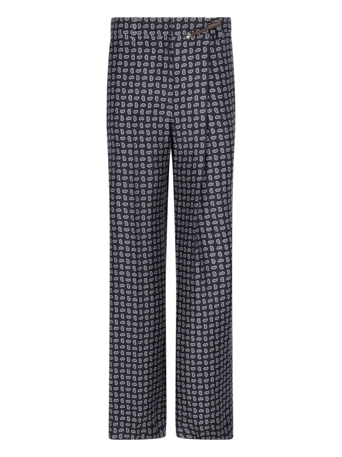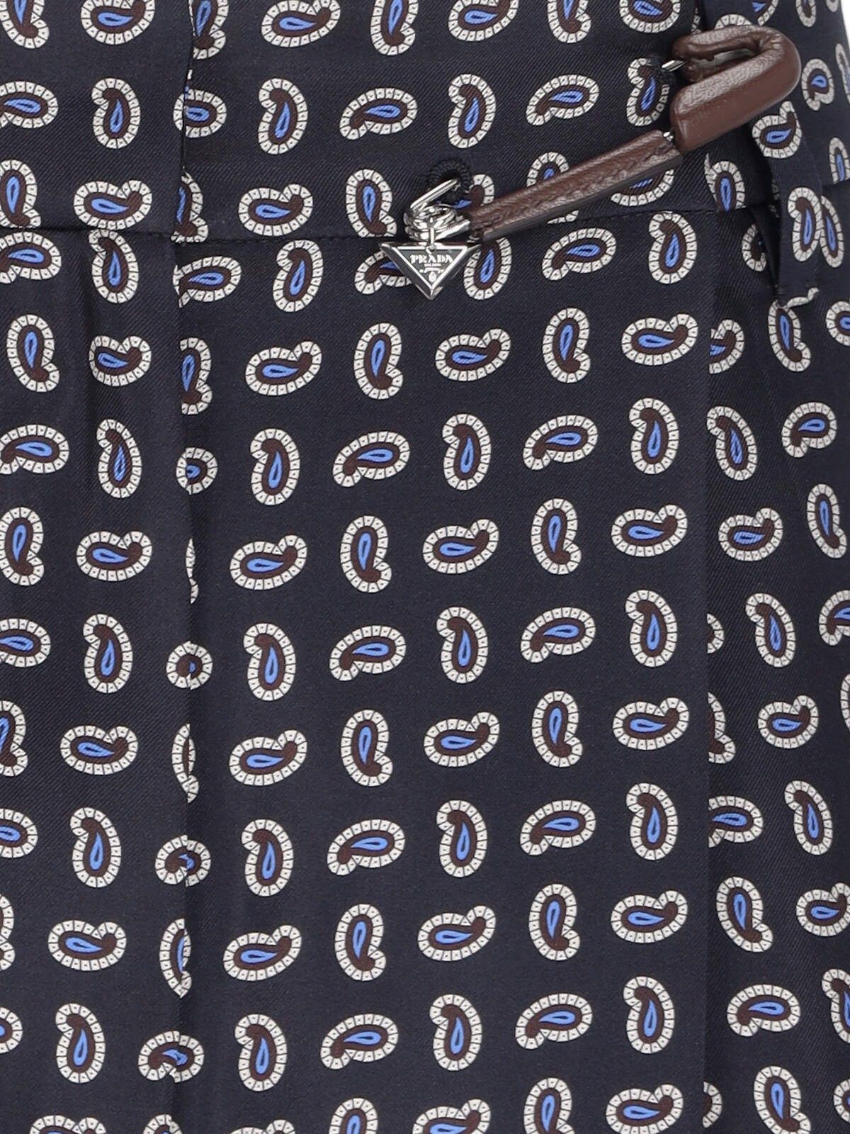 Pantaloni dritti in seta Prada, blu, dettagli bianchi, motivo stampa paisley all-over, a vita alta, chiusura zip e gancio, dettaglio spilla con logo triangolo in metallo smaltato, due tasche piatte laterali, due tasche a filetto retro, gamba dritta.