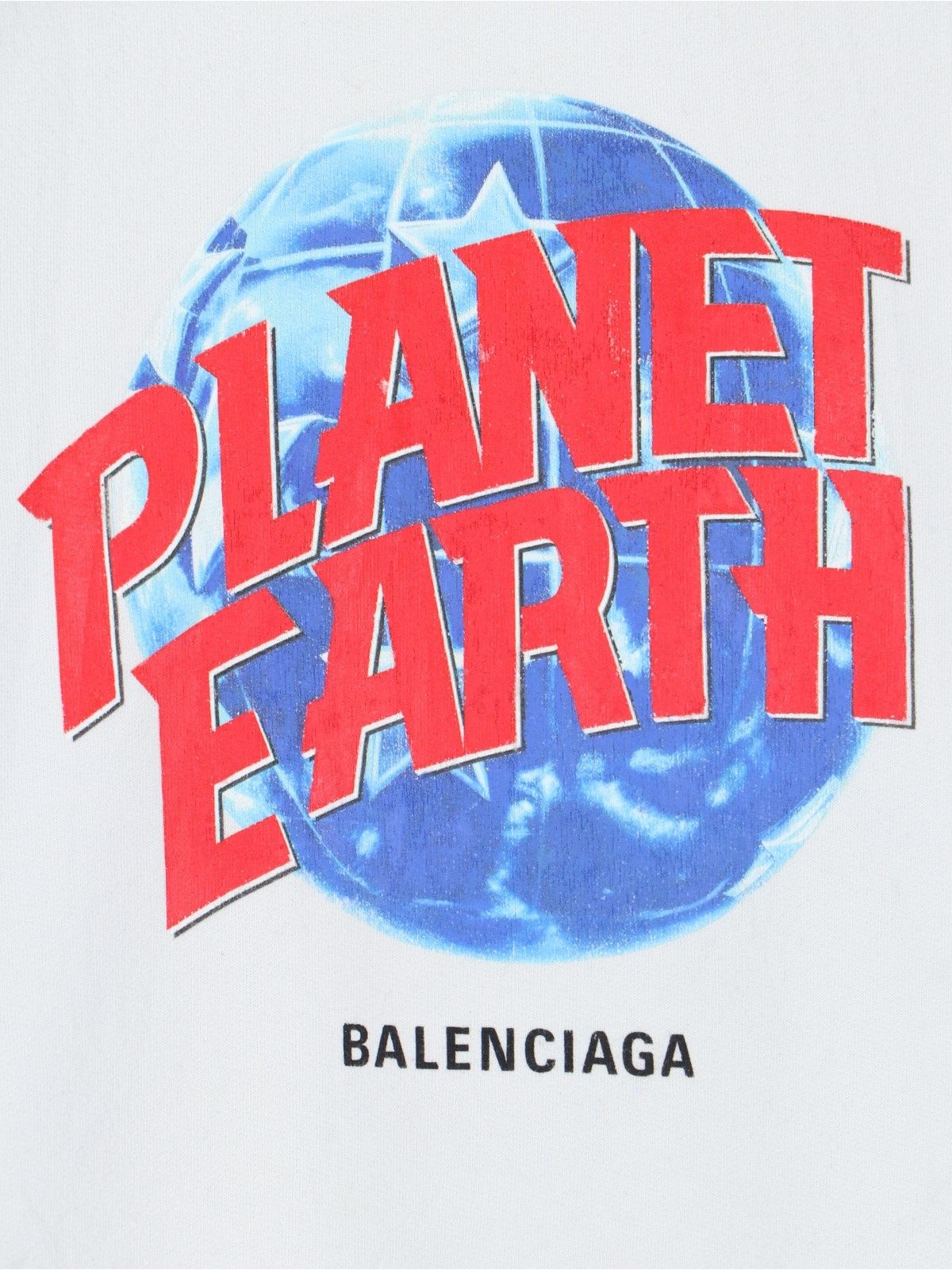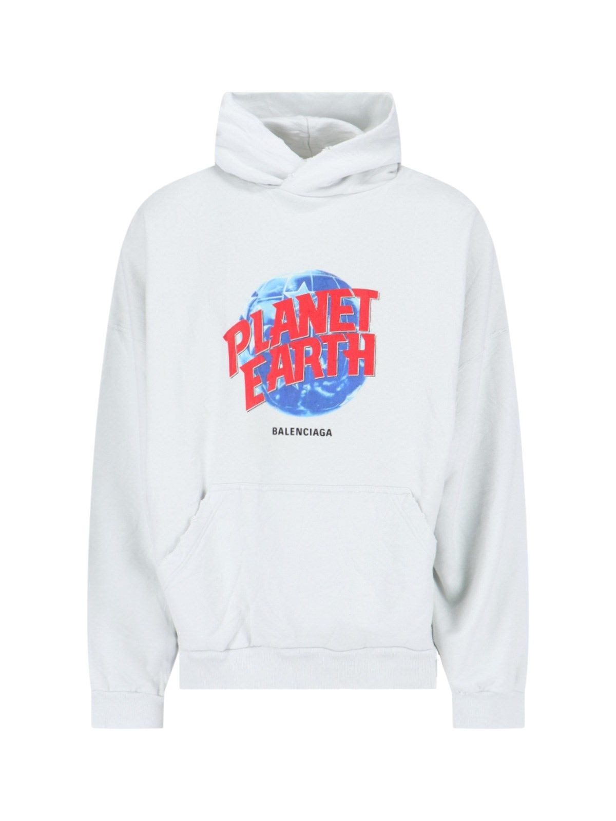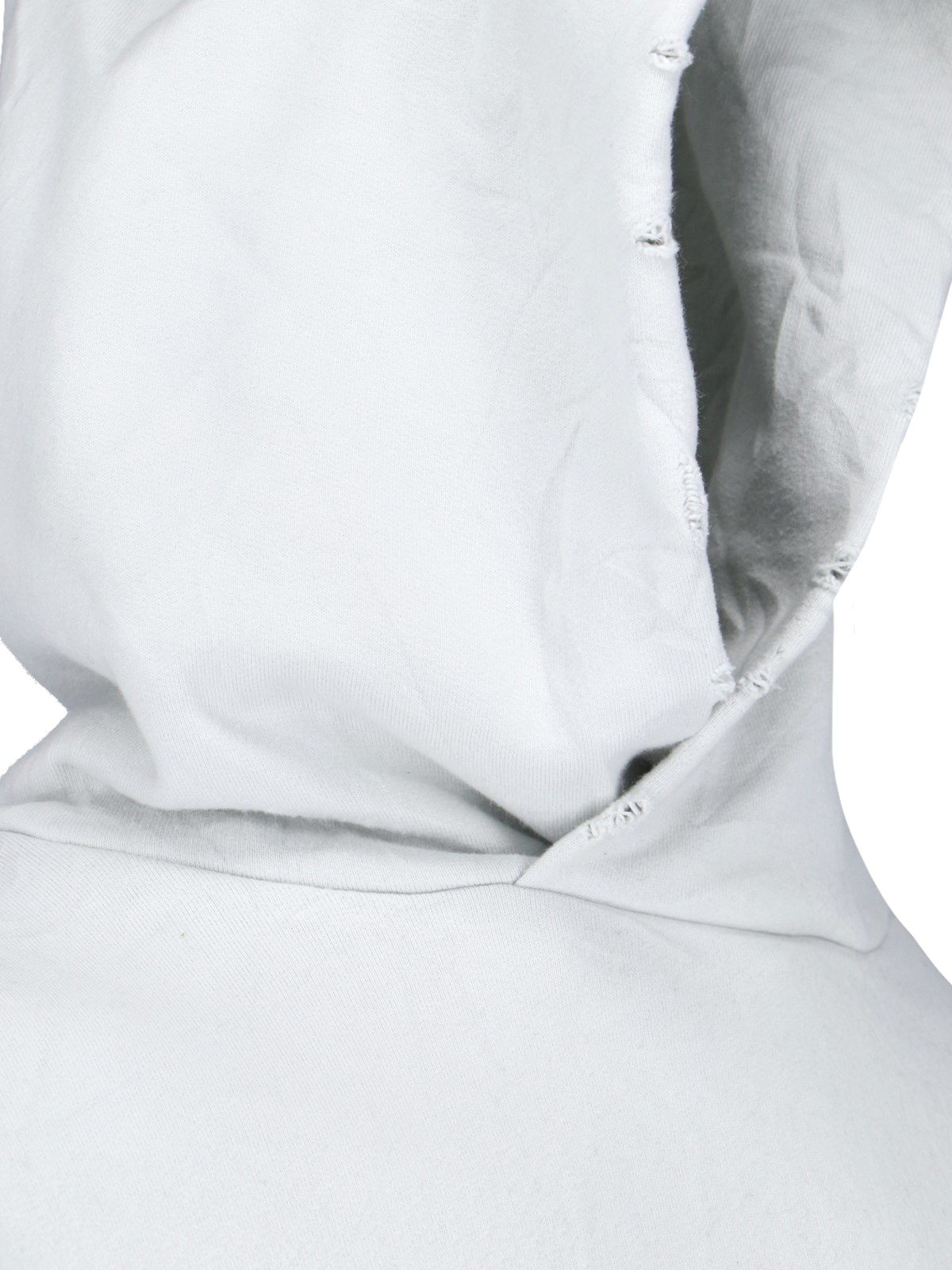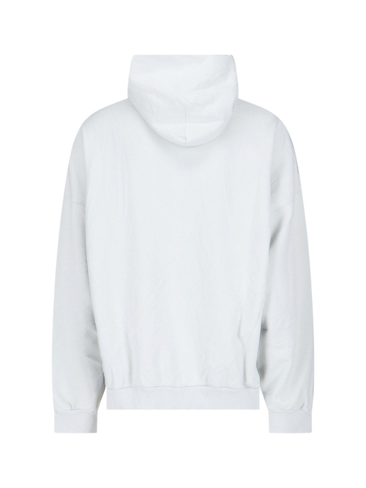 Felpa cappuccio Balenciaga, in cotone bianco, effetto crinkle, cappuccio dettagli destroyed, spalle scese, stampa logo rossa e blu frontale, una maxi tasca su fondo, polsini elastici, finiture a costine, orlo dritto.