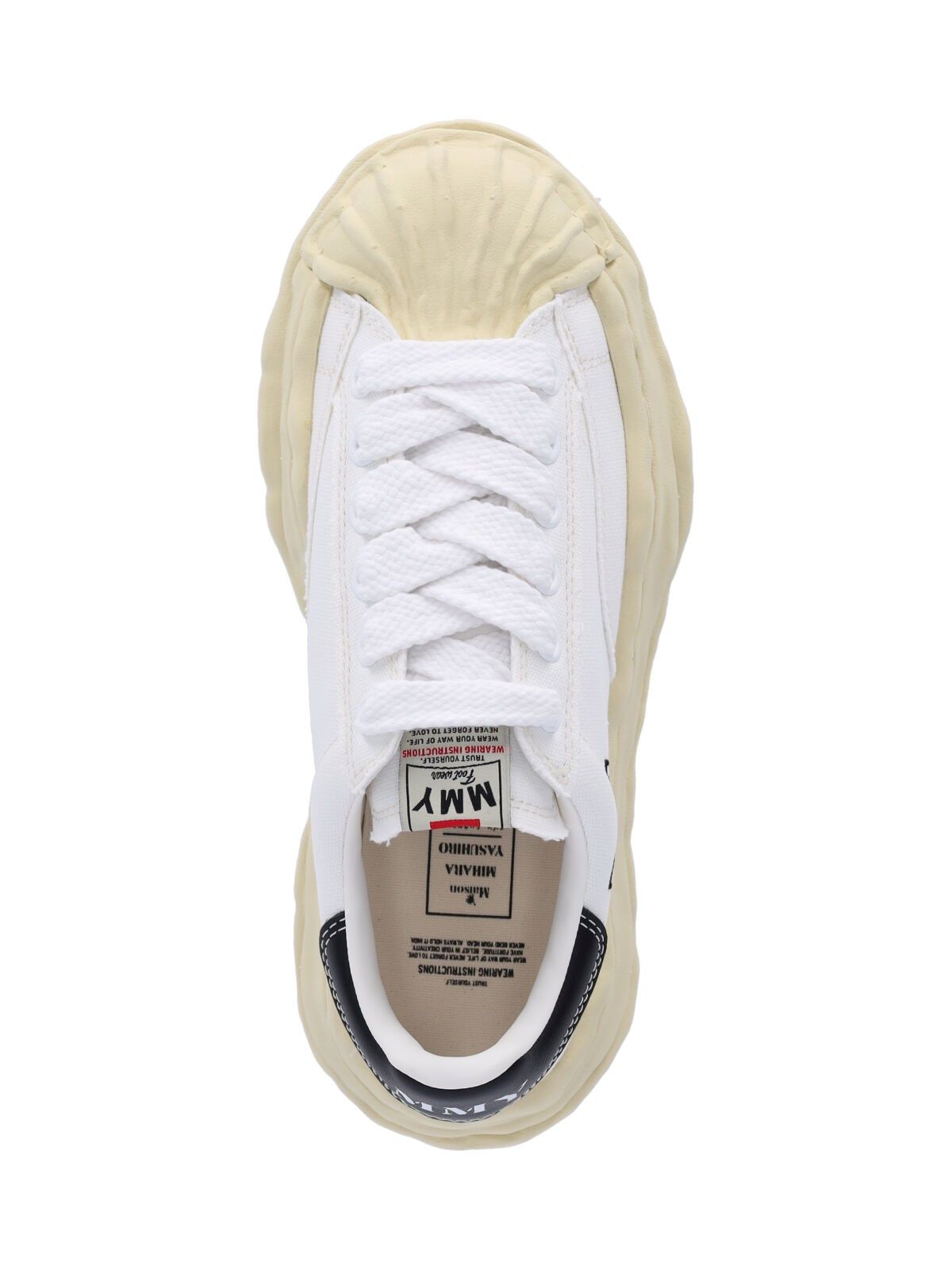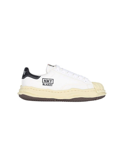 Sneakers low-top "Blakey VL OG" Maison Mihara Yasuhiro, in cotone bianco, punta tonda texturizzata, chiusura lacci, etichetta logo linguetta, ricamo logo a contrasto laterale, stampa logo bianca su tab retro in pelle a contrasto, suola texturizzata in gomma.