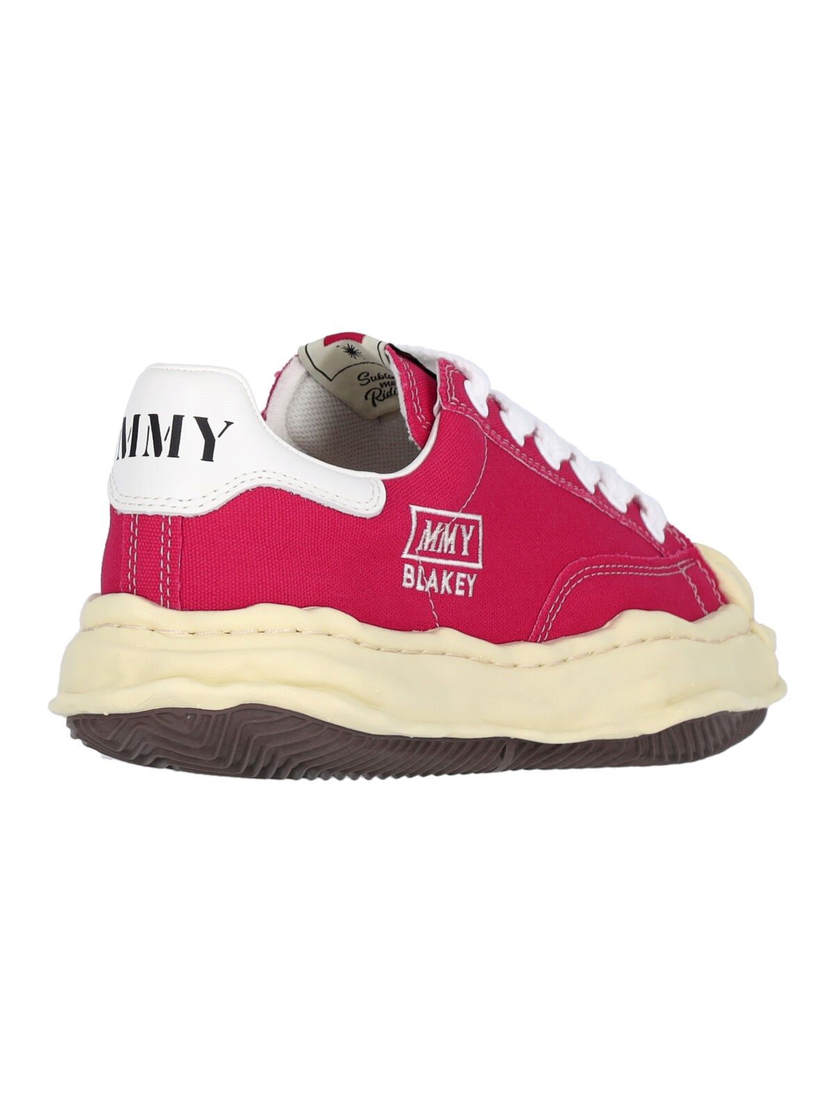 Sneakers low-top "Blakey VL OG" Maison Mihara Yasuhiro, in cotone rosso, punta tonda texturizzata, chiusura lacci, etichetta logo linguetta, ricamo logo bianco laterale, stampa logo a contrasto su tab retro in pelle bianca, suola texturizzata in gomma.
