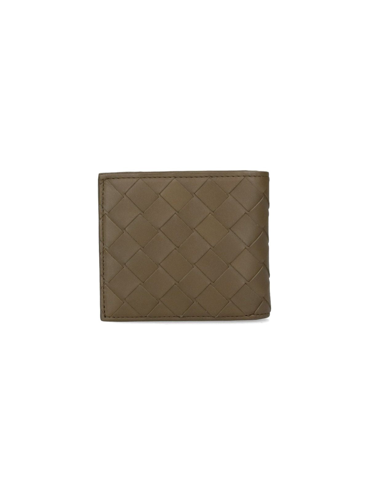 Portafoglio "Bi-Fold" Bottega Veneta, in pelle intrecciata verde, otto slot carte interni, due tasche piatte interne, due tasche banconote.