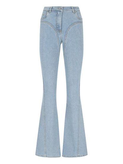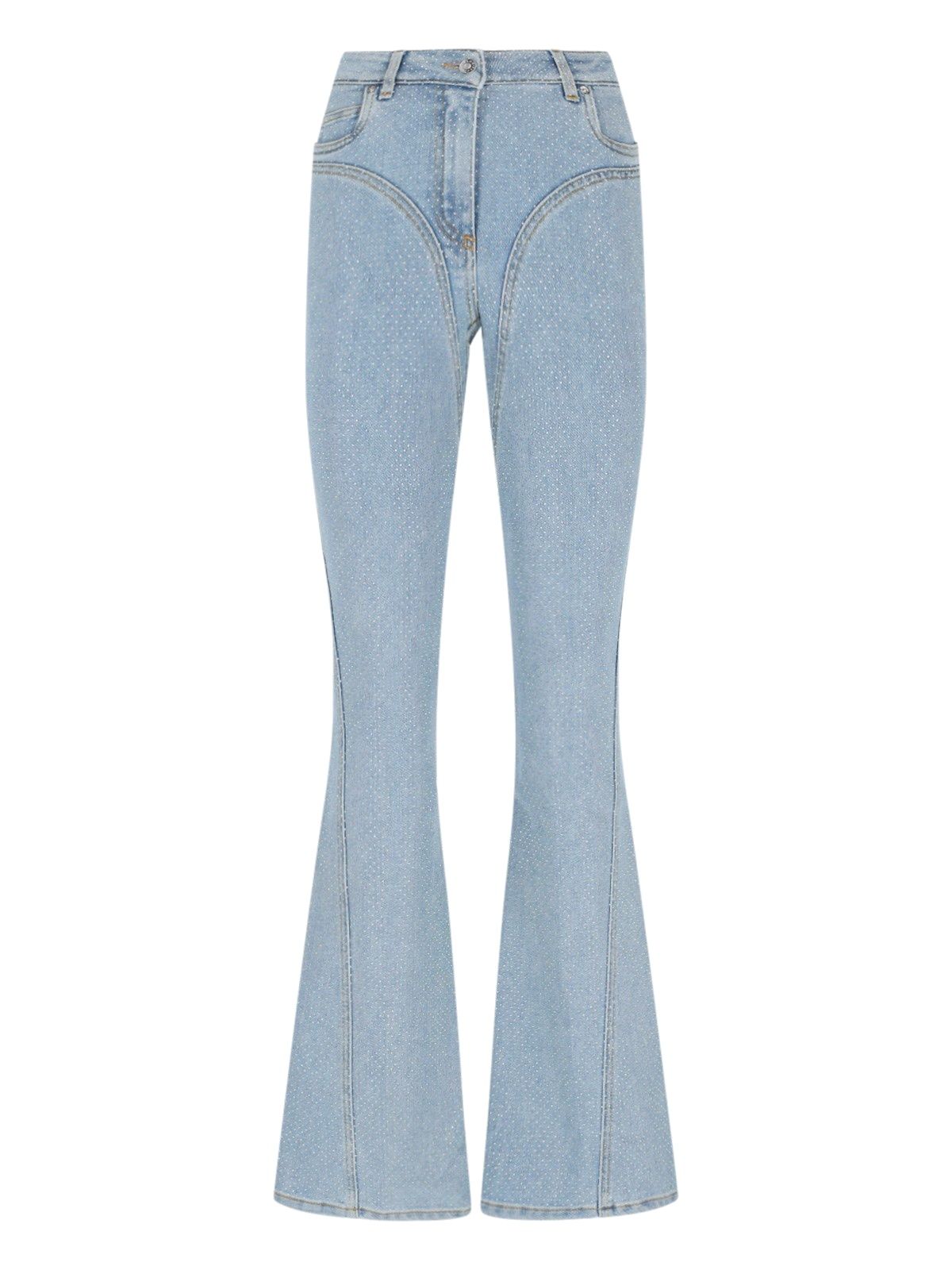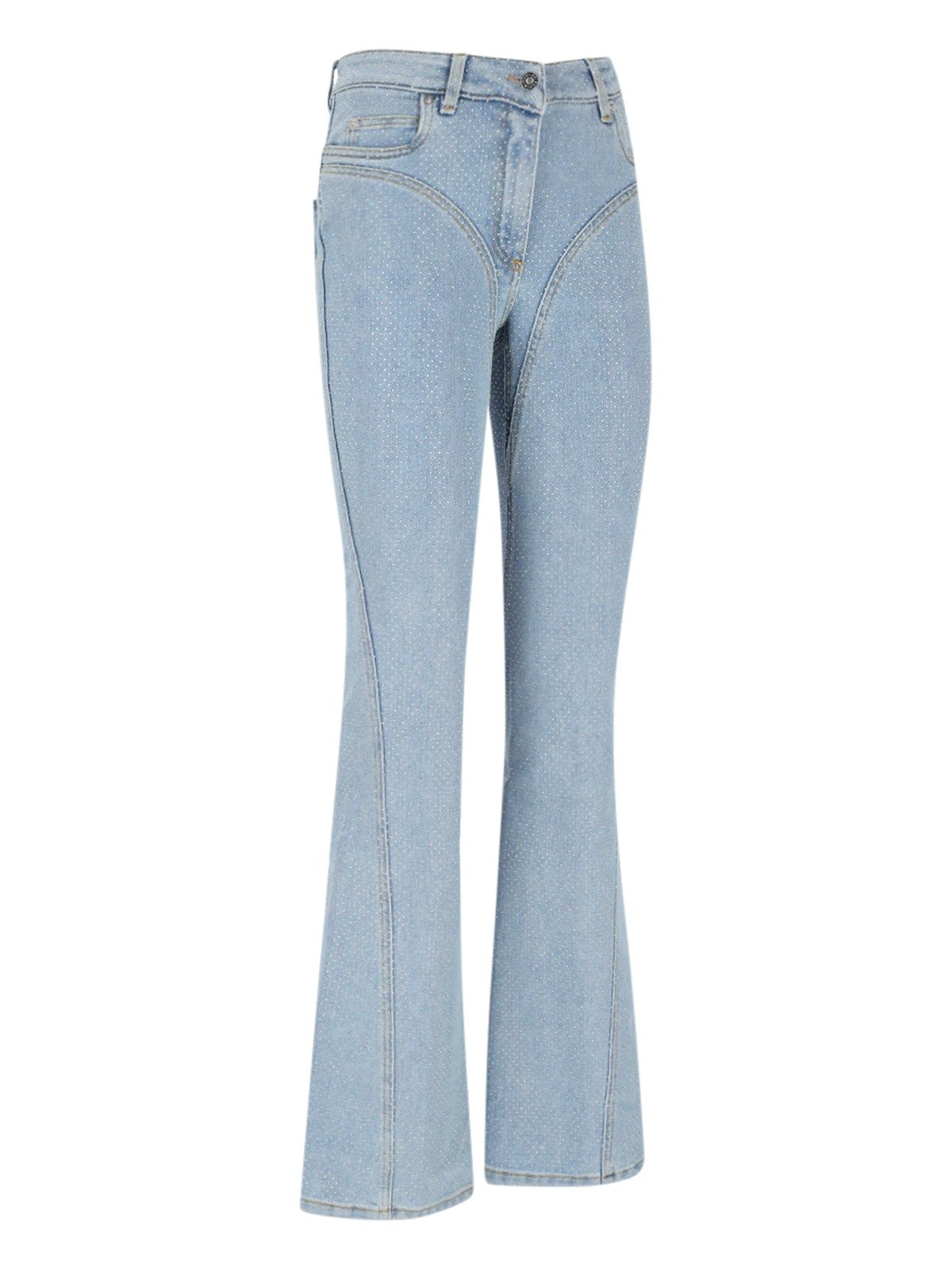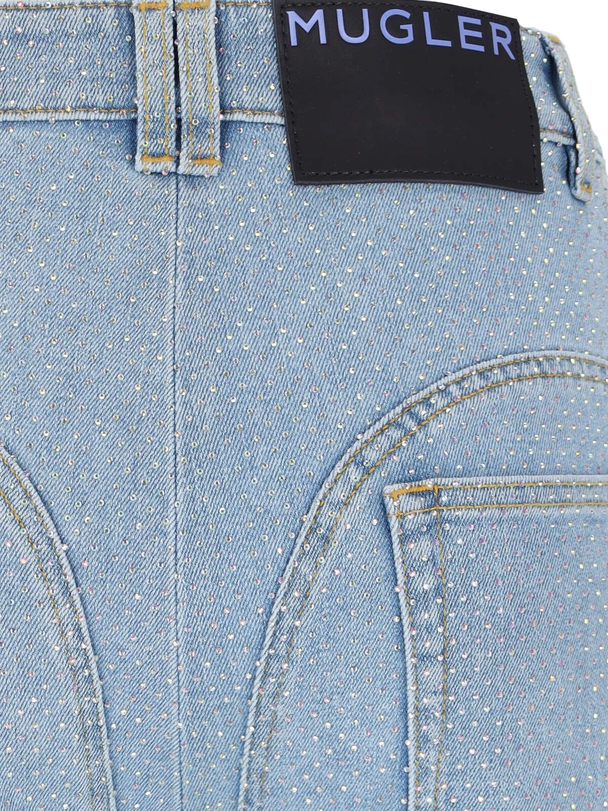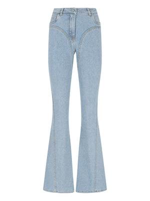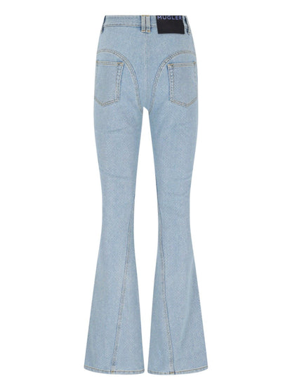 Jeans strass all-over Mugler, in misto cotone azzurro, dettaglio strass applicati all-over, vita alta, passanti cintura, chiusura bottoni e zip, due tasche fronte e retro, dettaglio cuciture, design bootcut.