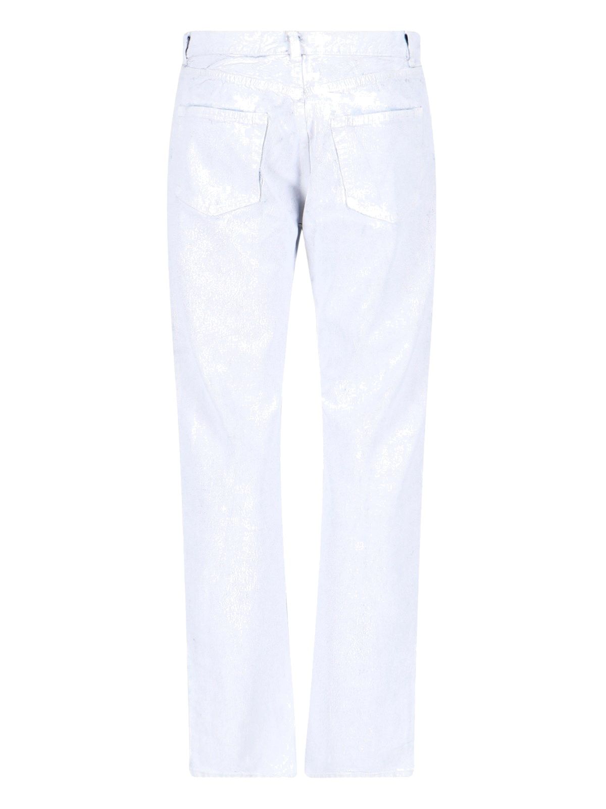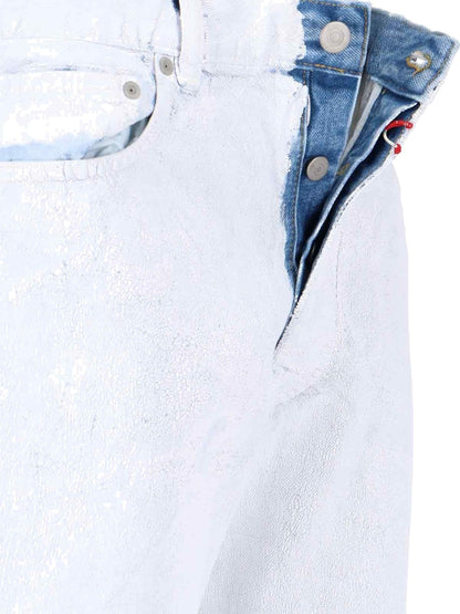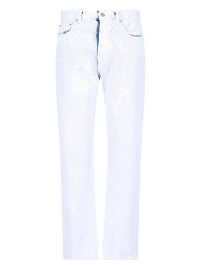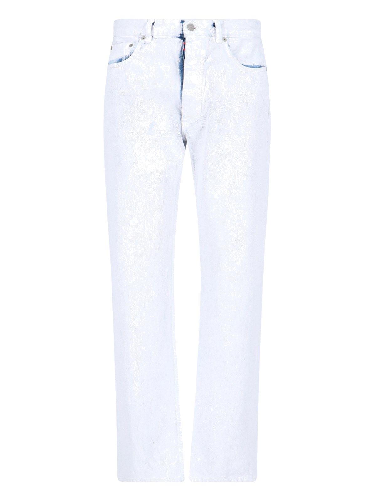 Jeans dritti design spalmato Maison Margiela, in denim azzurro design spalmato bianco, chiusura bottoni e gancio, design cinque tasche, orlo dritto.