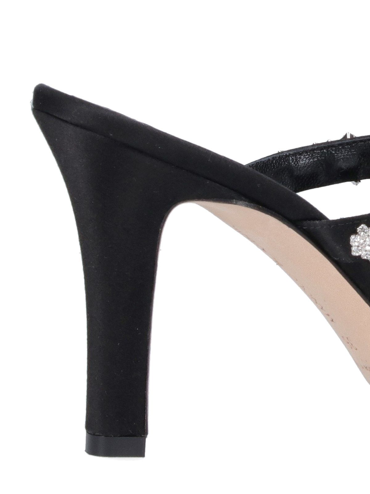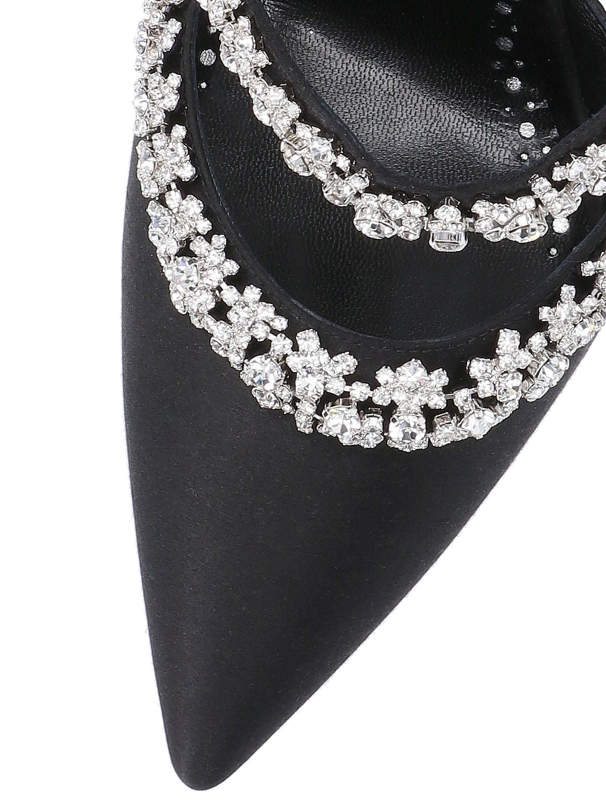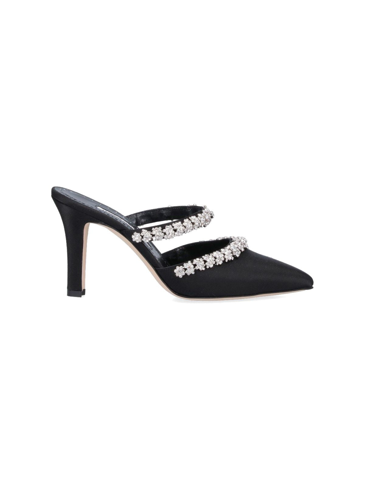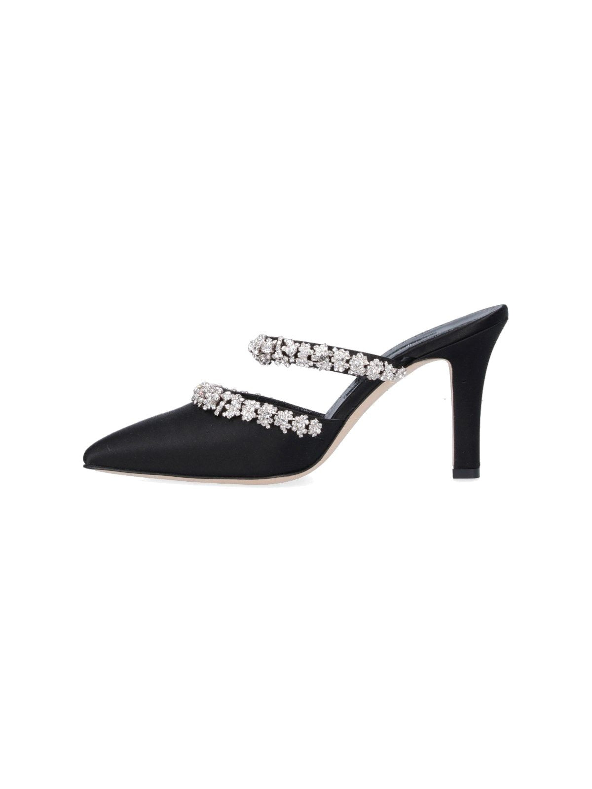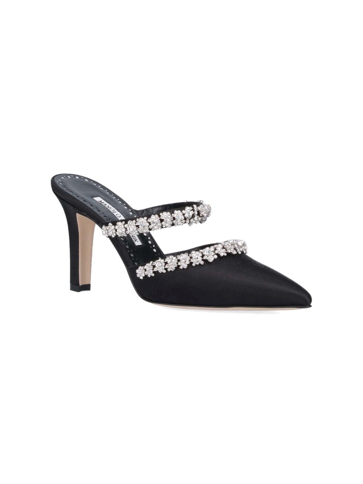 Mules "Vedadamu" Manolo Blahnik, in satin nero, a punta, applicazione cristalli argentati, vestibilità slip-on, tacco a stiletto, suola in pelle.
