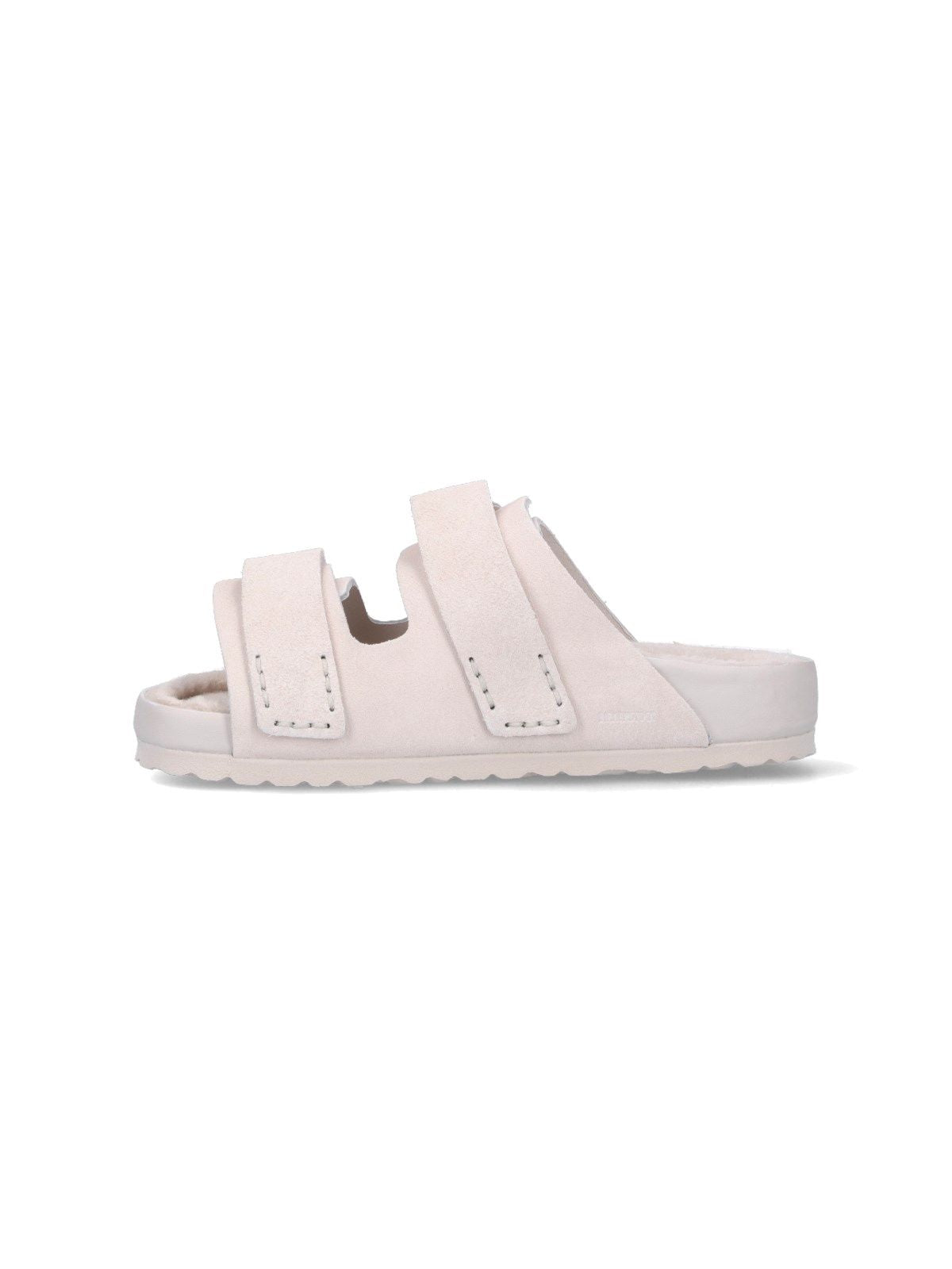 Sandali "Uji" Birkenstock x Tekla, in suede panna, punta tonda aperta, due fasce strap superiori, vestibilità slip-on, pelliccia interna, plantare anatomico in sughero e lattice, suola in gomma, dust bag inclusa.