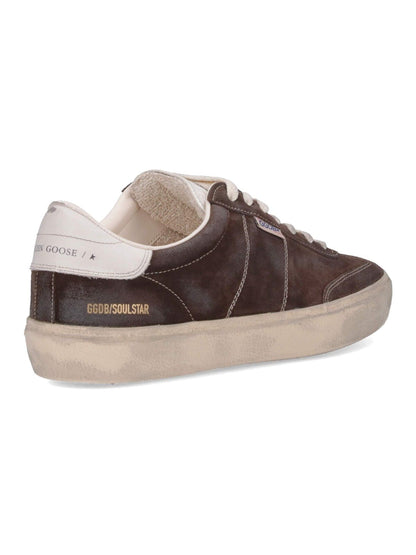 Sneakers "Soul Star" Golden Goose, in pelle marrone, tonalità scura, dettagli in suede tono su tono, punta tonda, chiusura lacci, etichetta logo nera su linguetta, etichetta logo bianca laterale, stampa logo dorata laterale, stampa logo nera su tab bianco, suola in gomma panna, dettagli usured.