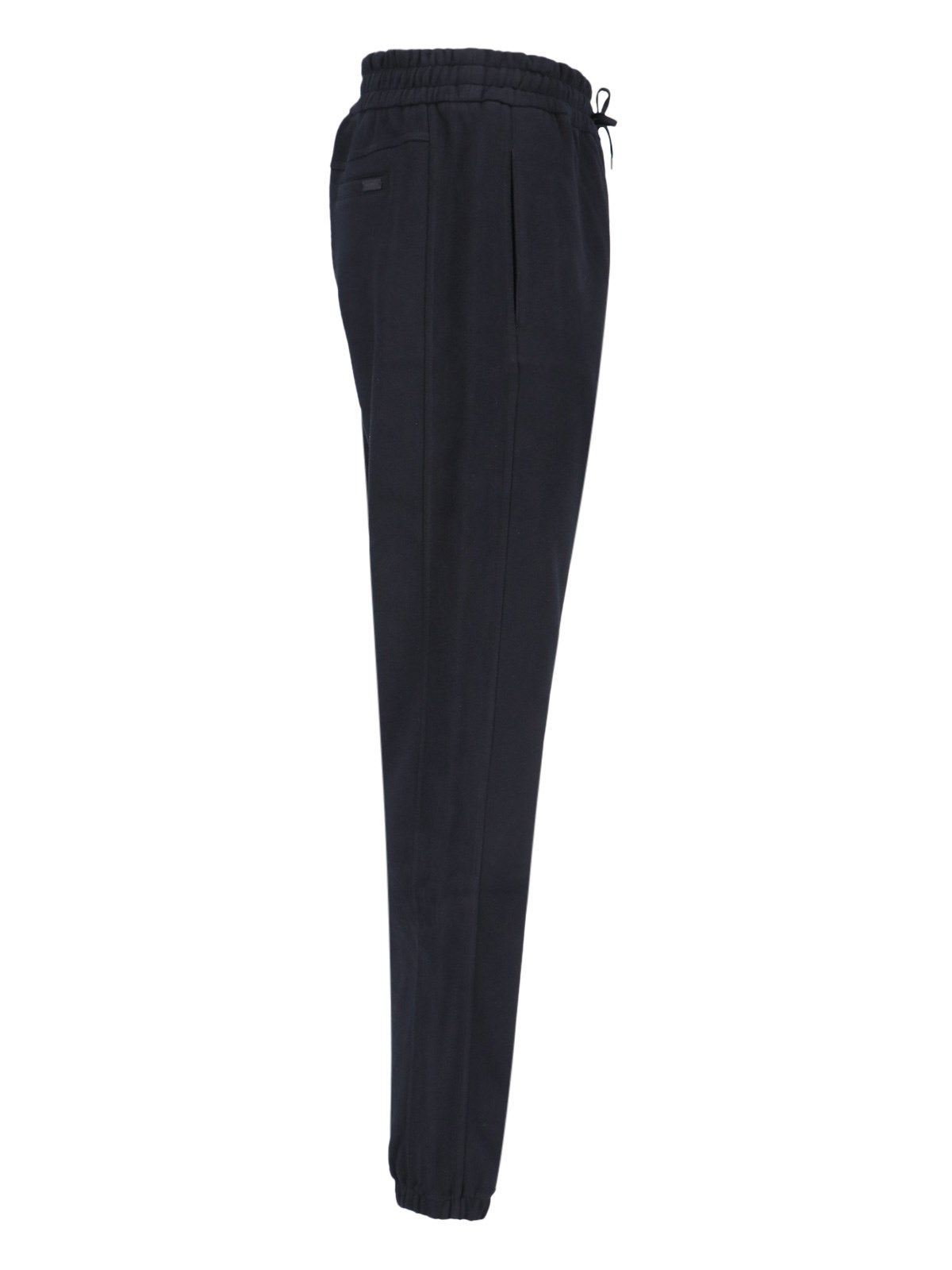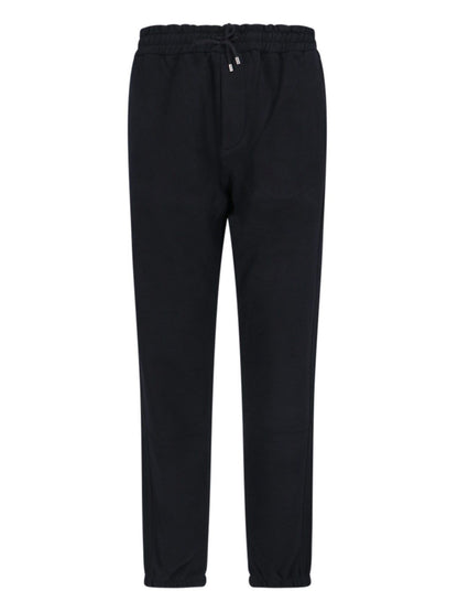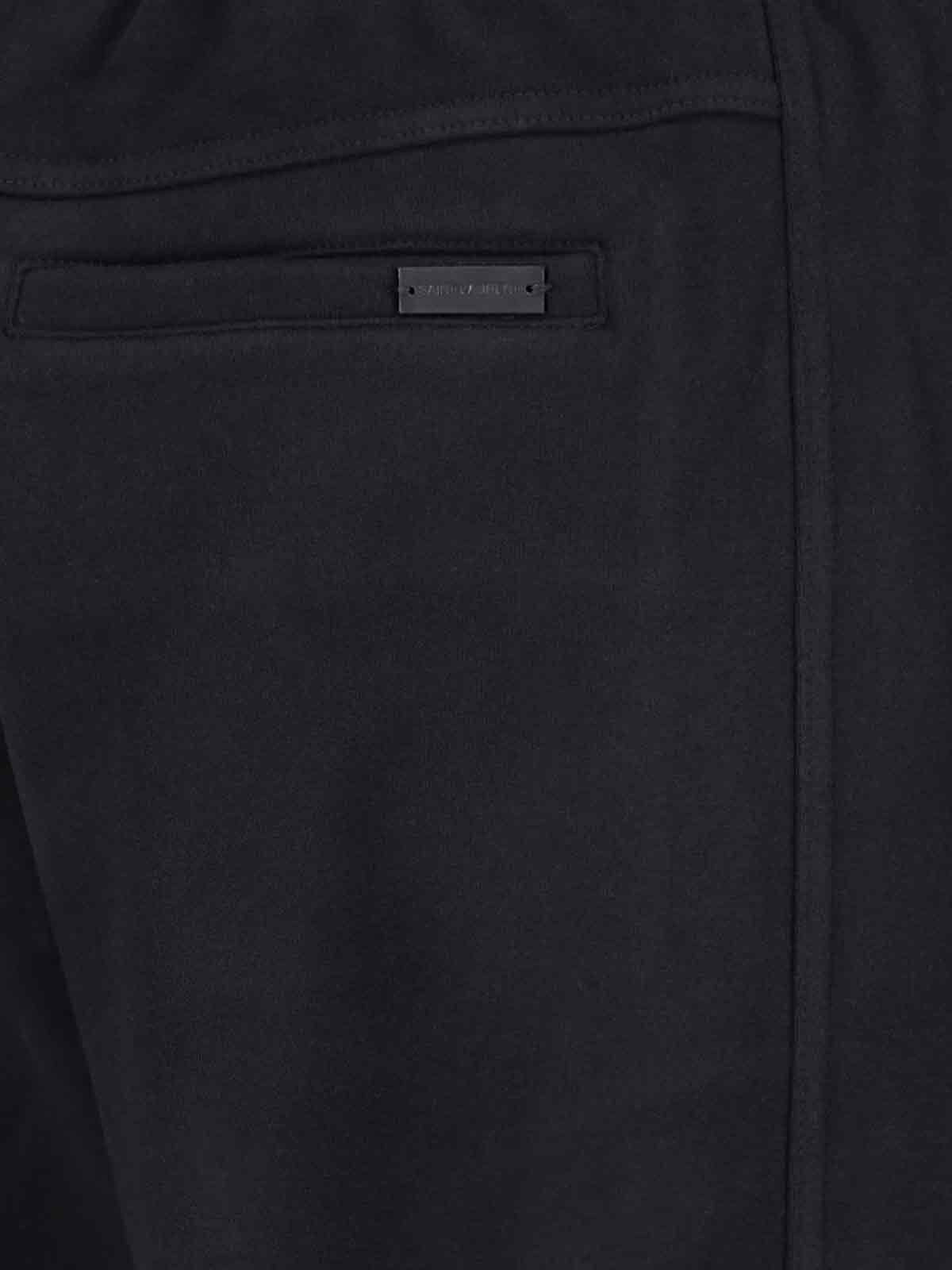 Pantaloni sportivi logo Saint Laurent, in cotone nero, vita media, coulisse, due tasche laterali, due tasche a filetto retro, dettaglio targhetta logo in metallo tono su tono, gamba dritta, dettaglio fondo elasticizzato