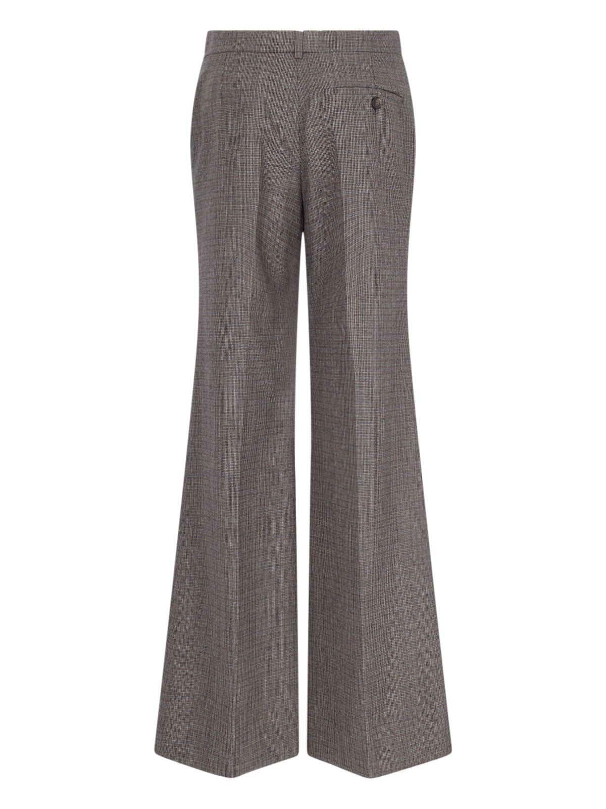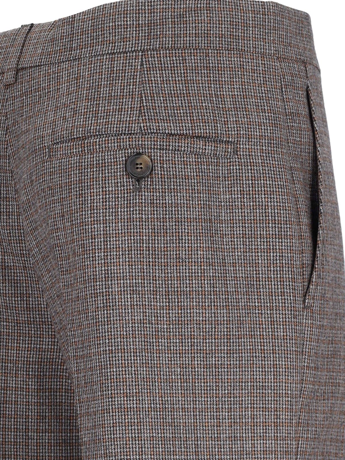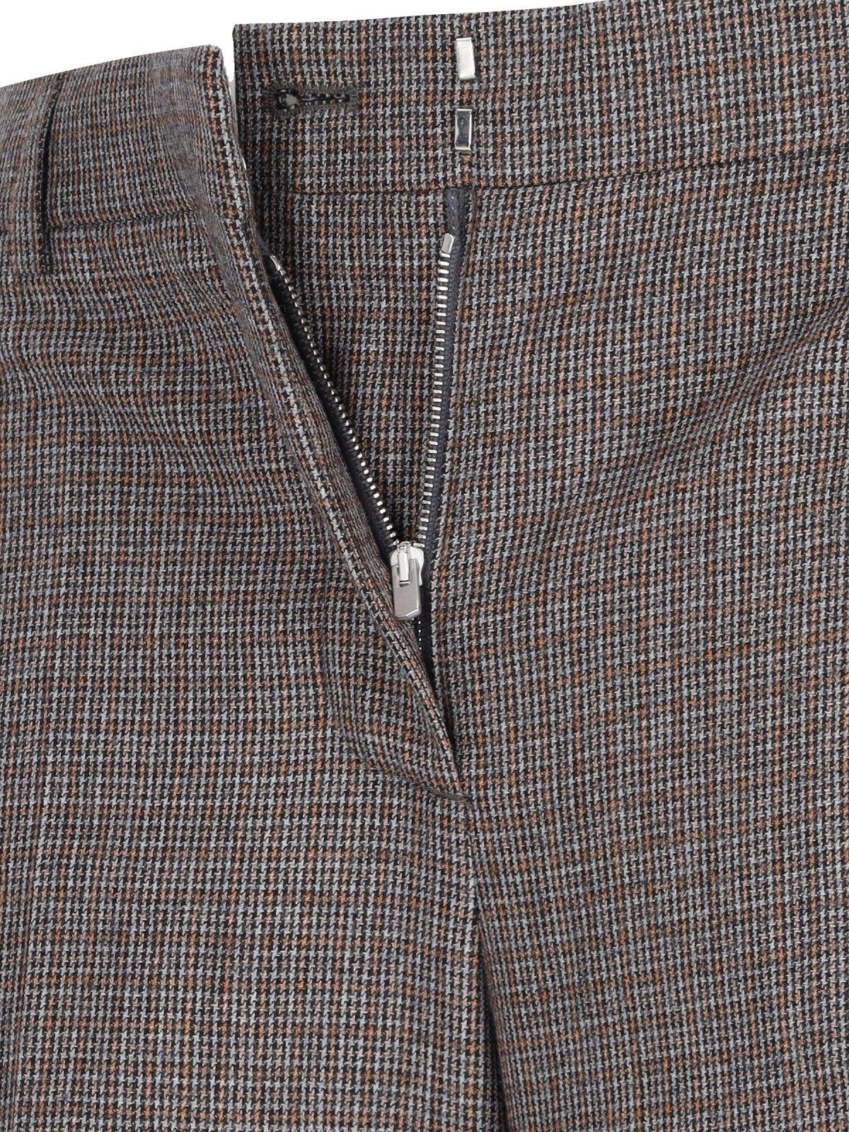 Pantaloni in lana Stella McCartney, marroni mélange, motivo a quadri, dettagli grigi, a vita alta, passanti cintura, chiusura ganci e zip, due tasche laterali, una tasca a filetto bottone retro, gamba svasata.