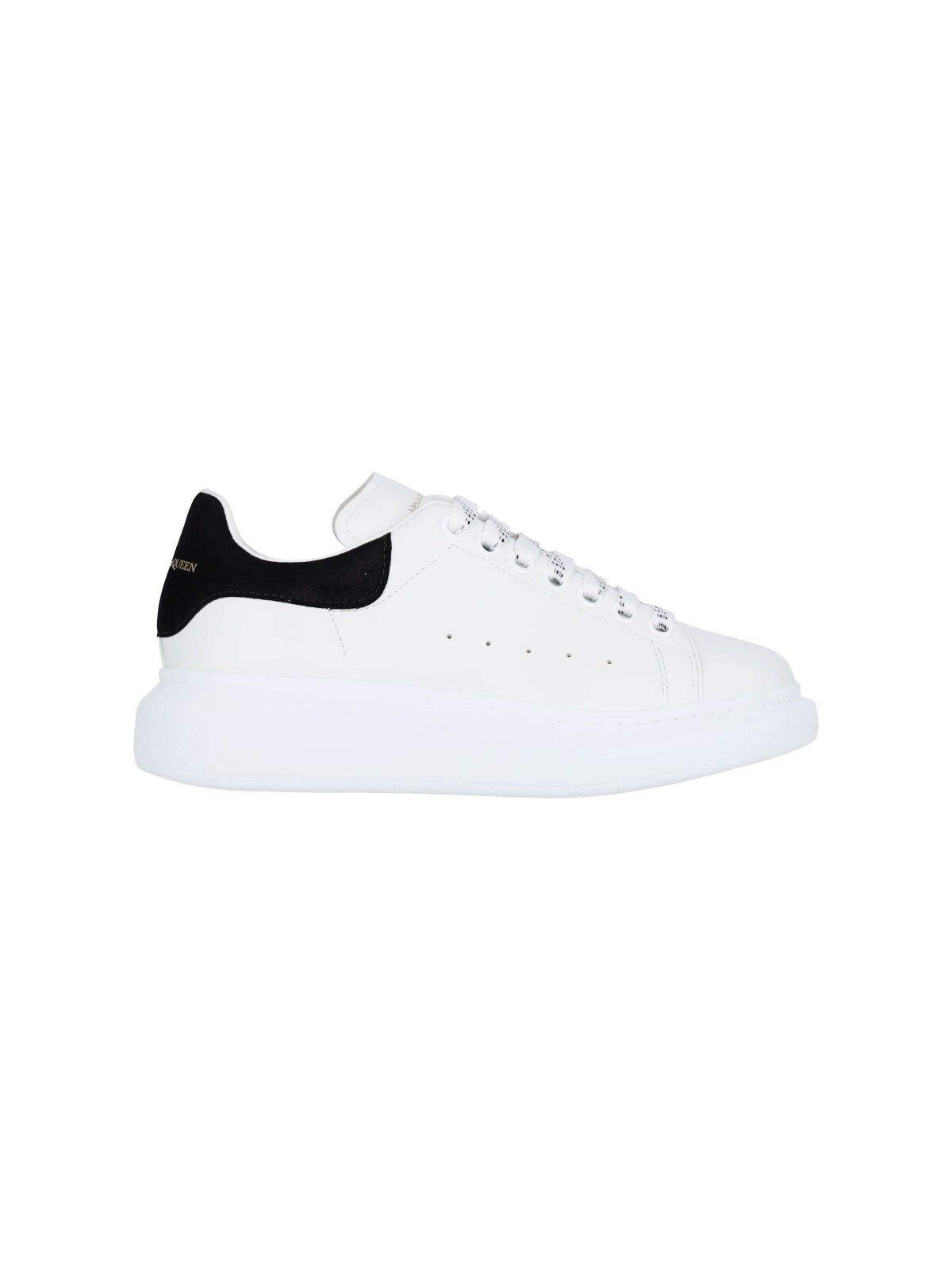 Sneakers "Oversize" Alexander McQueen, in pelle bianca, punta tonda, chiusura lacci, logo impresso dorato su linguetta, logo impresso dorato su tab retro in camoscio nero, suola oversize in gomma. In base alla disponibilità del brand, i lacci del prodotto potrebbero variare rispetto a quelli mostrati in foto.