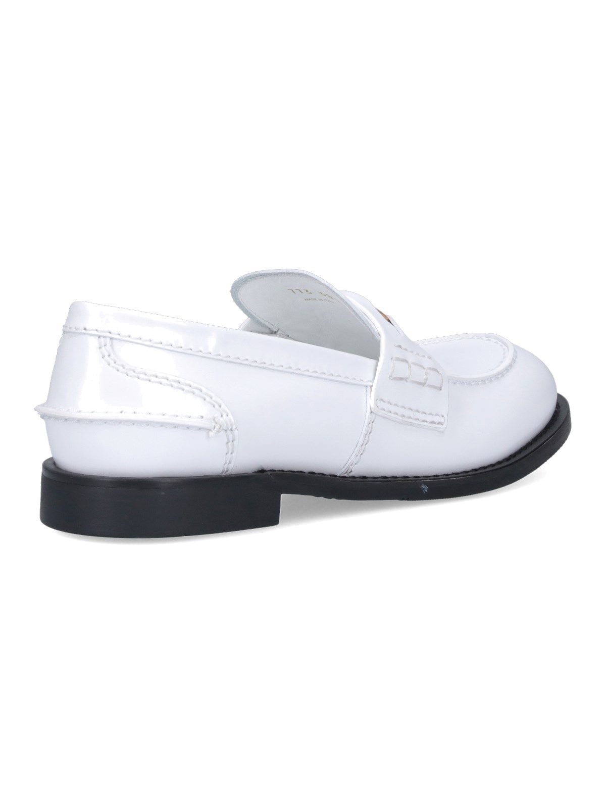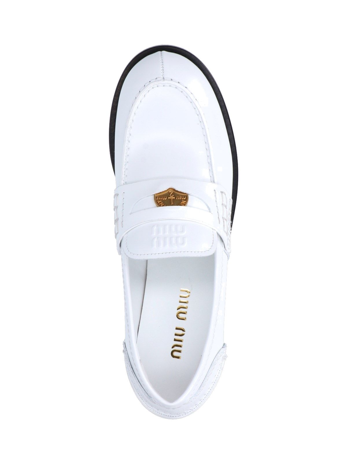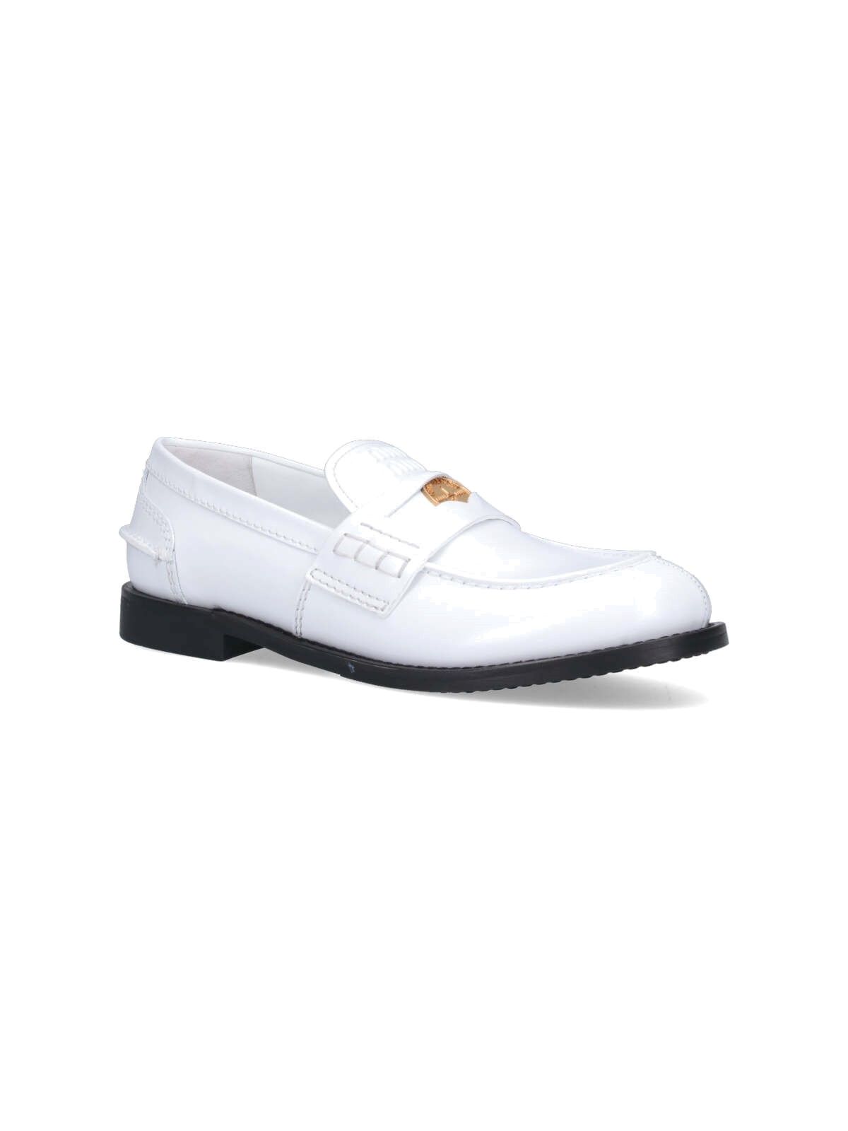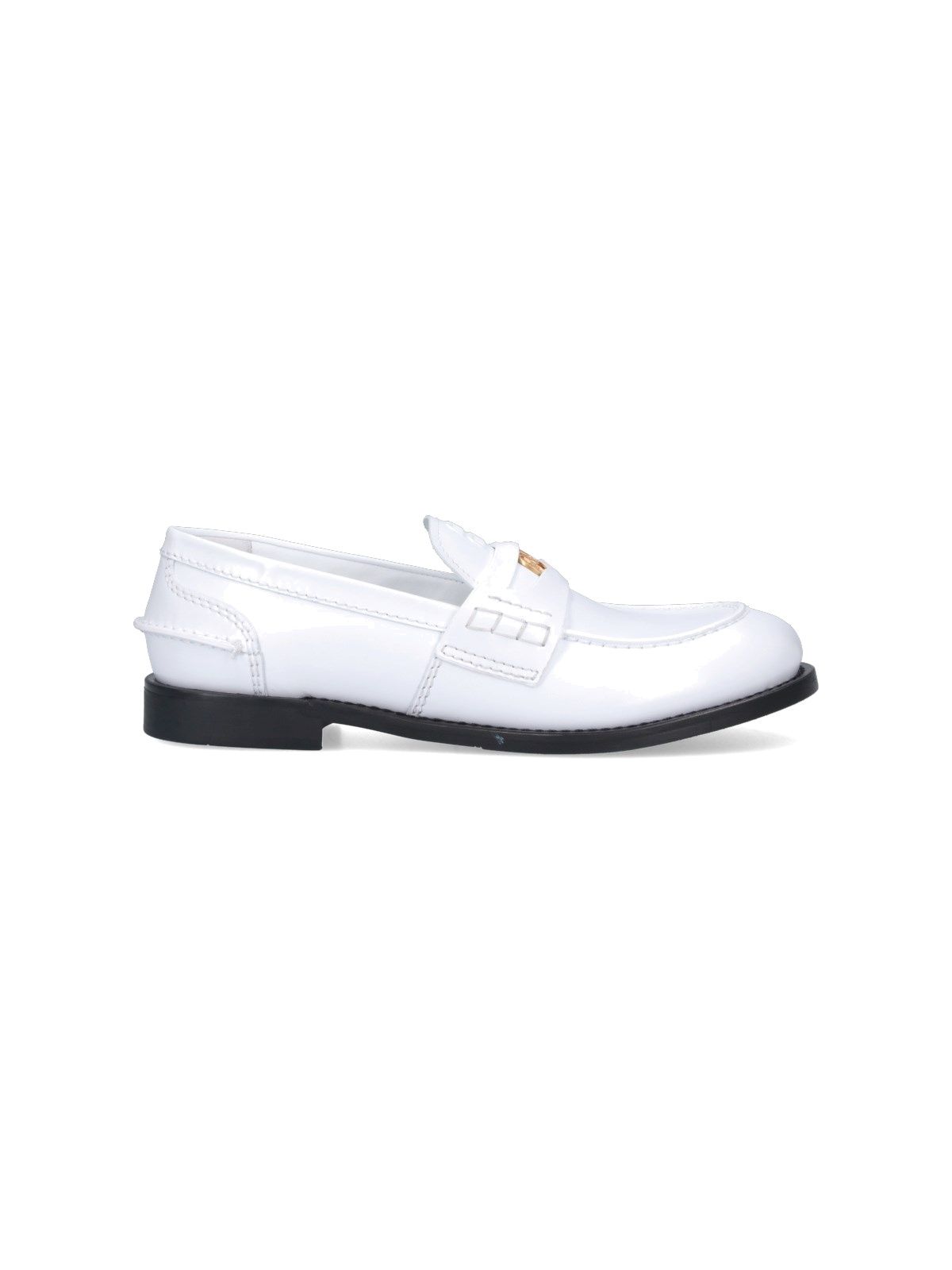 Mocassini logo Miu Miu, in pelle bianca, punta tonda, design slip-on, charm logo metallico dorato fronte, suola in cuoio.
