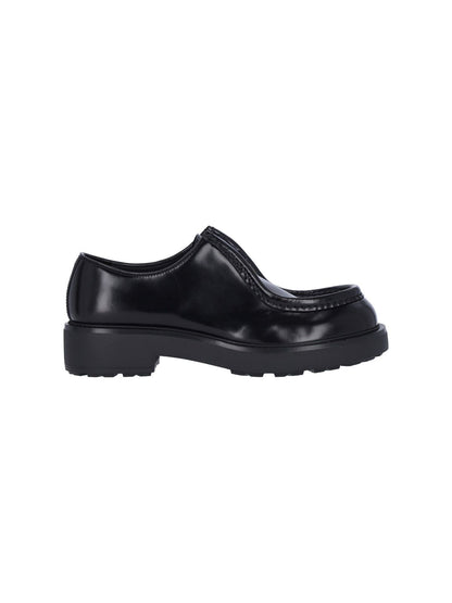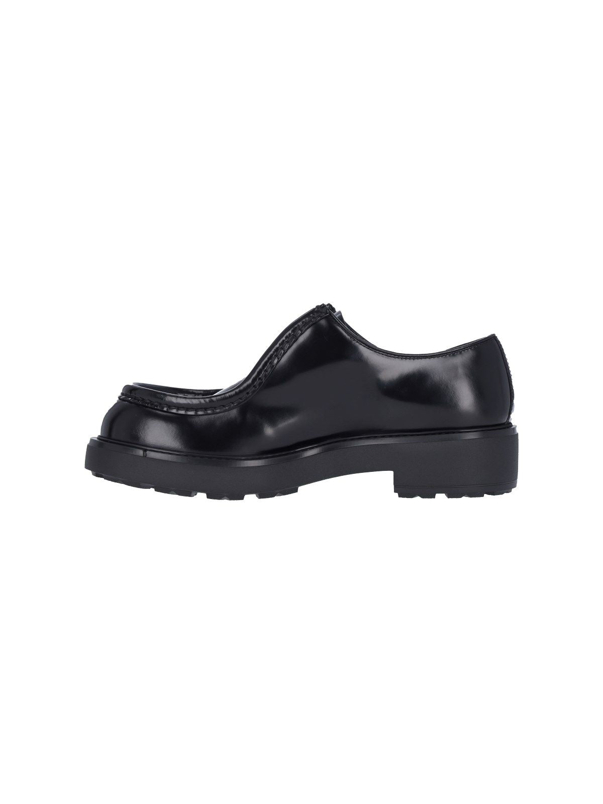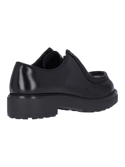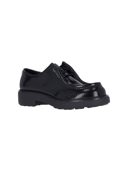 Scarpe Derby "Diapason" Prada, in pelle spazzolata nera, punta tonda, chiusura lacci, suola in gomma.