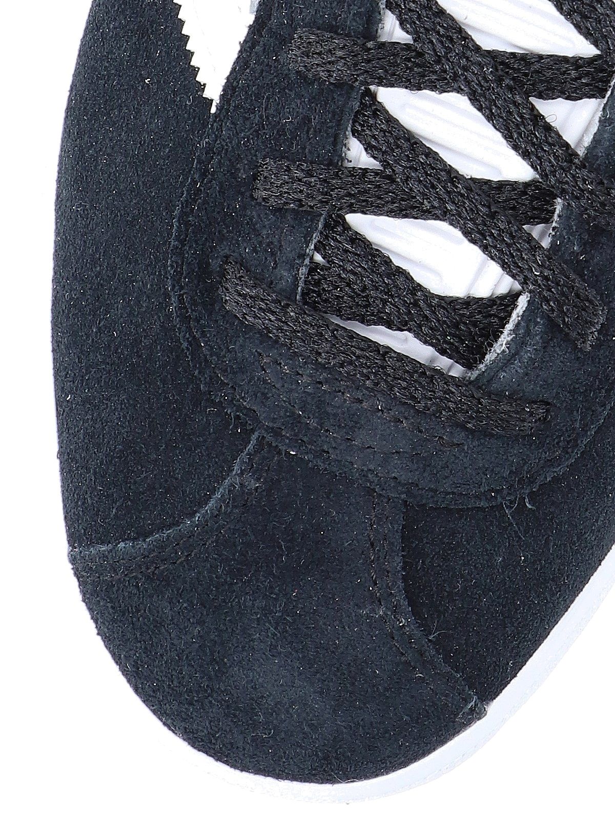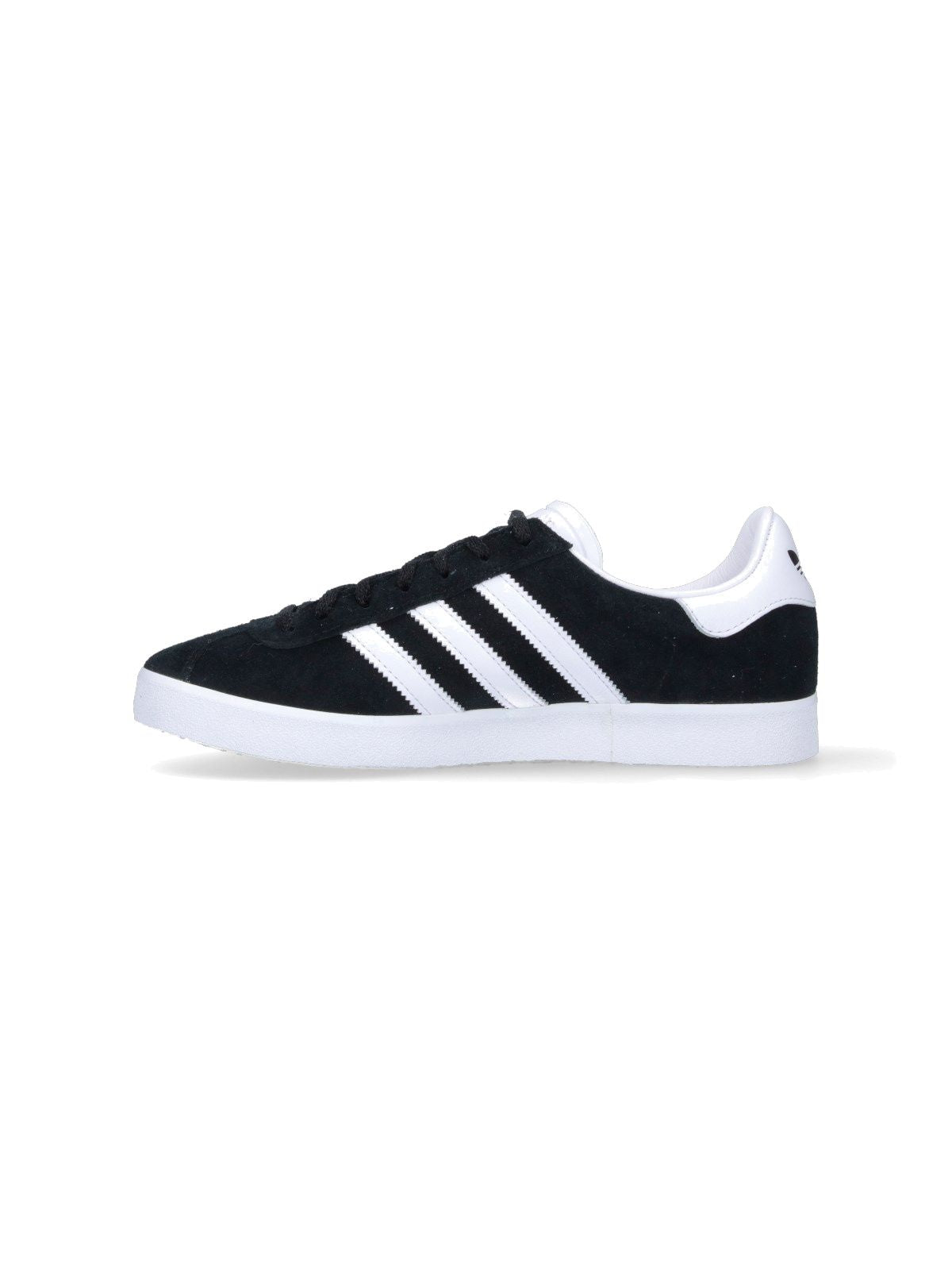 Sneakers "Gazelle 85" Adidas, in suede nero, punta tonda, chiusura lacci, etichetta logo applicata laterale, strisce iconiche in pelle bianca laterali, stampa logo dorata laterale, tab in pelle bianca retro dettaglio stampa logo dorata, suola in gomma.