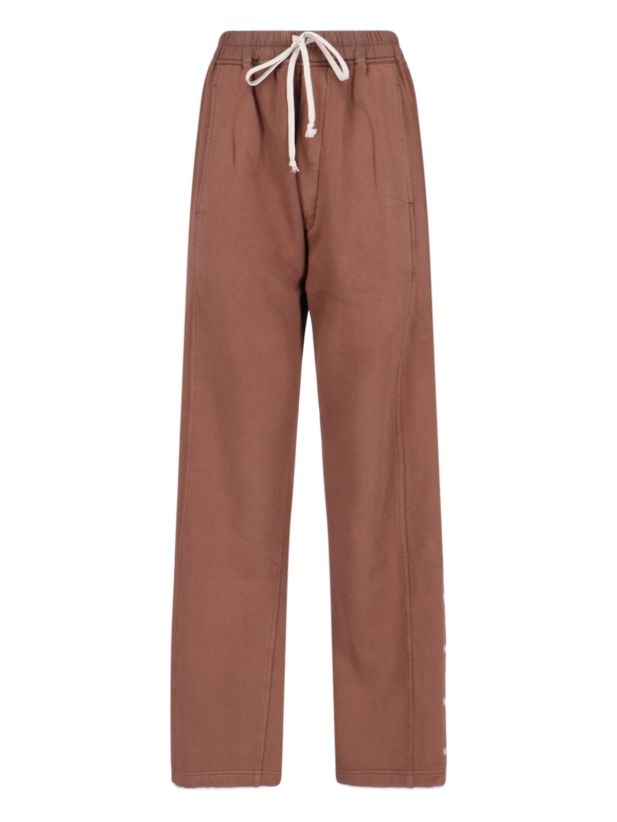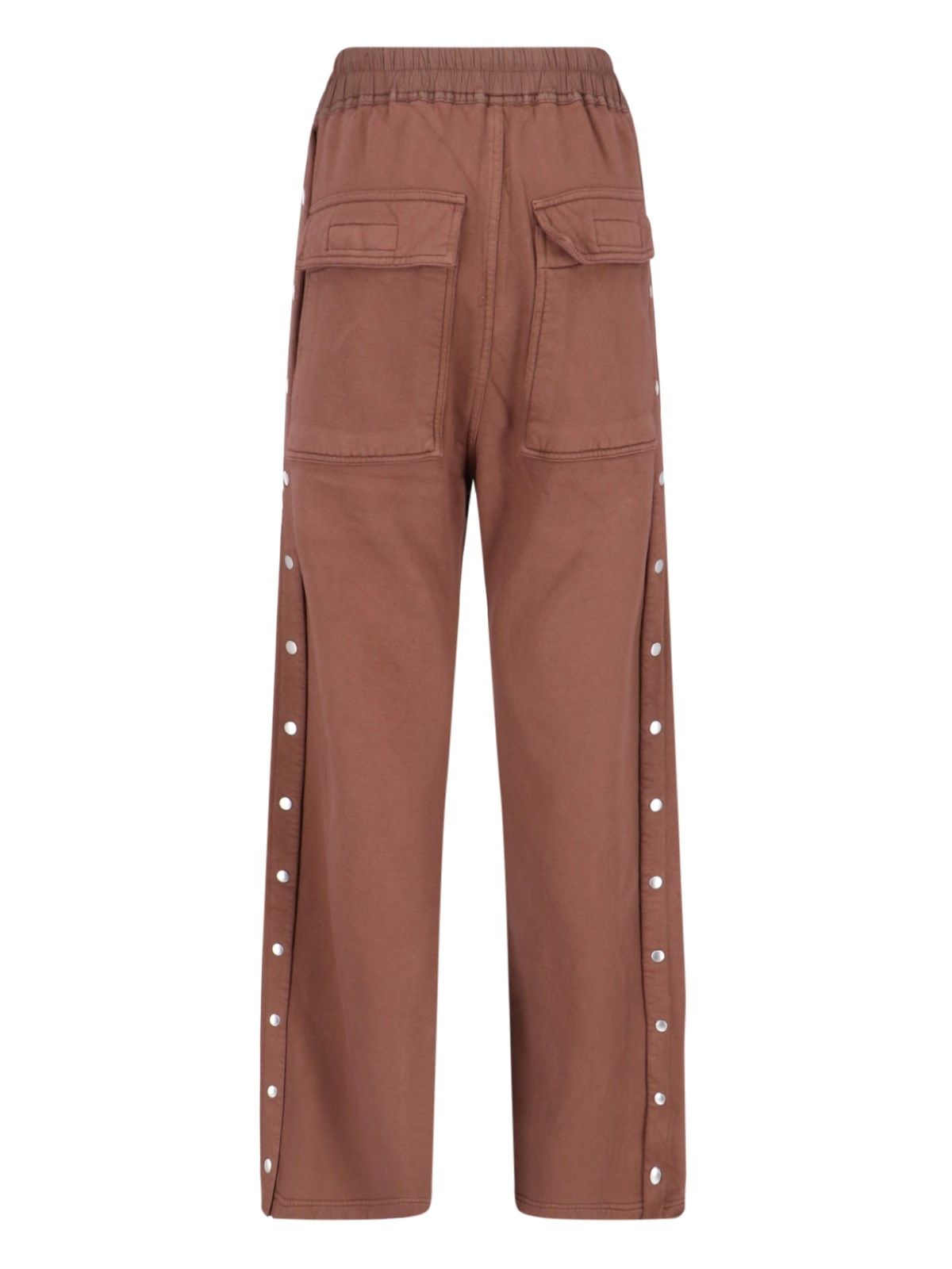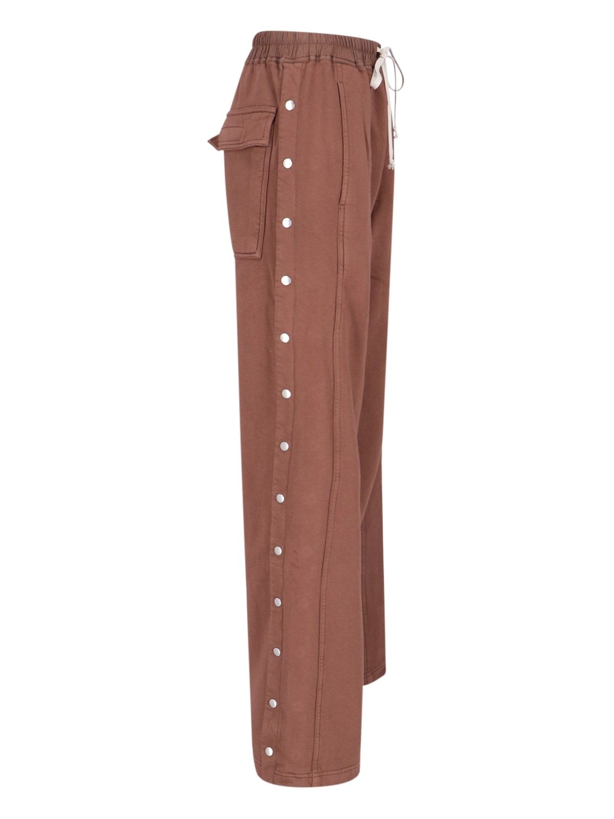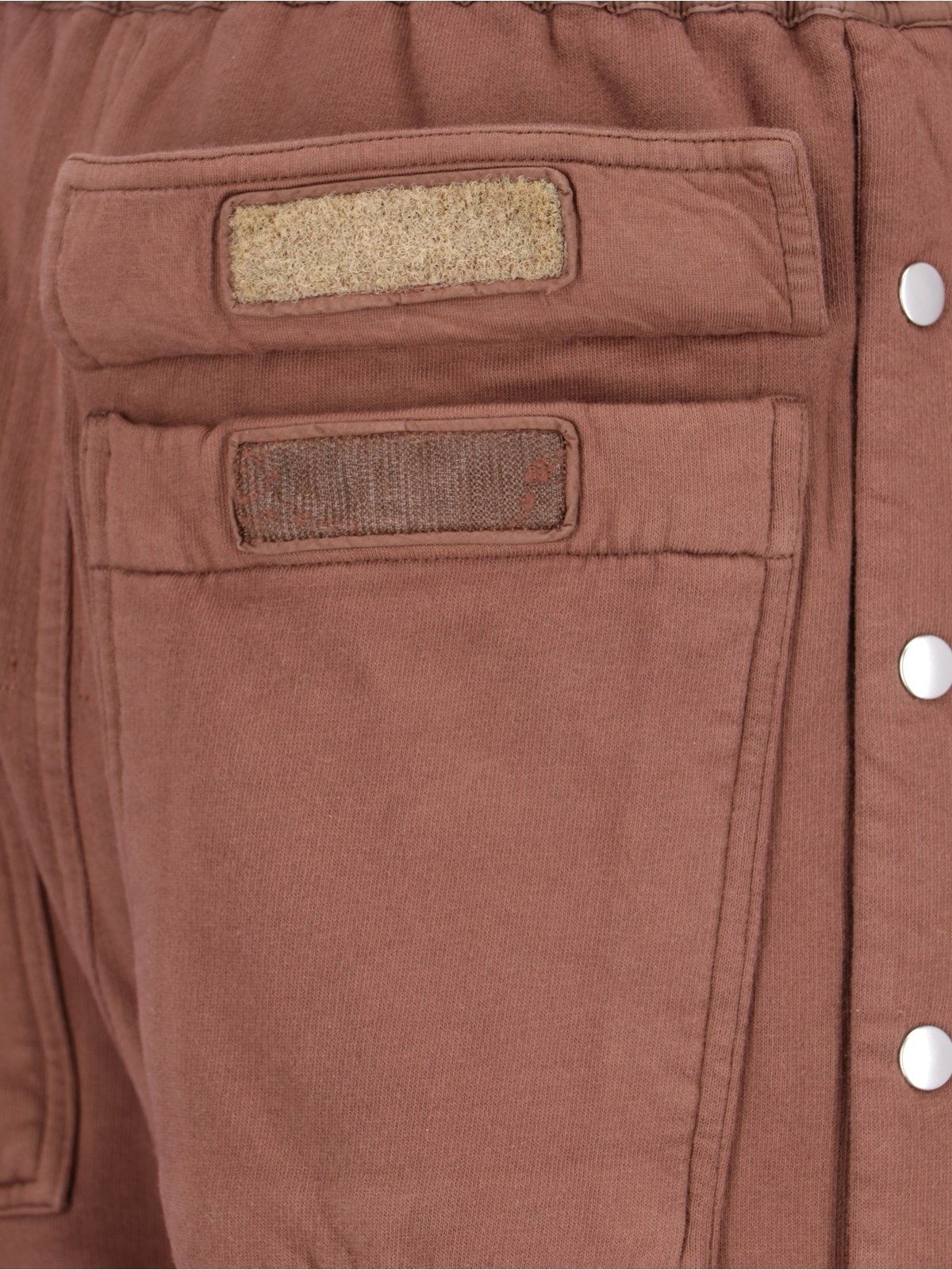 Pantaloni sportivi "Pusher Pants" Rick Owens DRKSHDW, in cotone marrone, vita media elasticizzata, chiusura coulisse, due tasche laterali, due tasche patta retro, dettaglio chiusura in velcro, spacchi laterali profondi, dettaglio regolabili con bottoni a pressione, gamba larga.