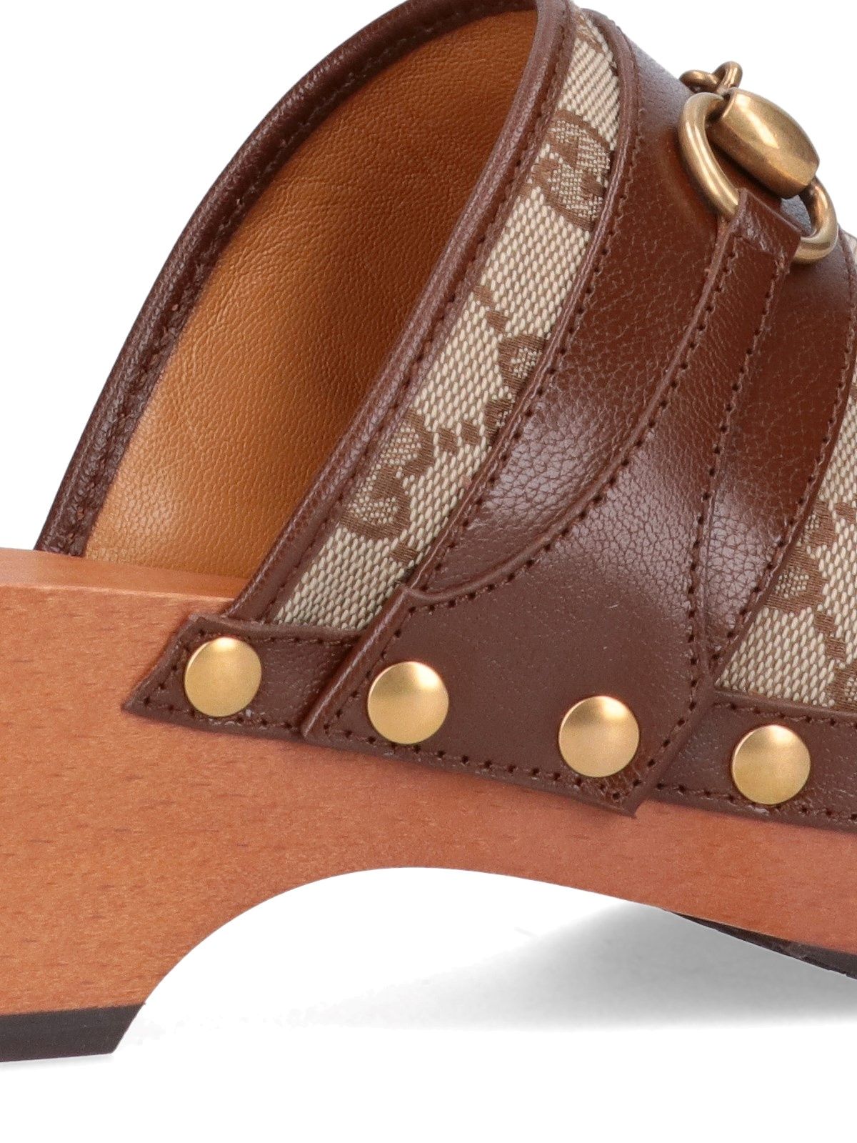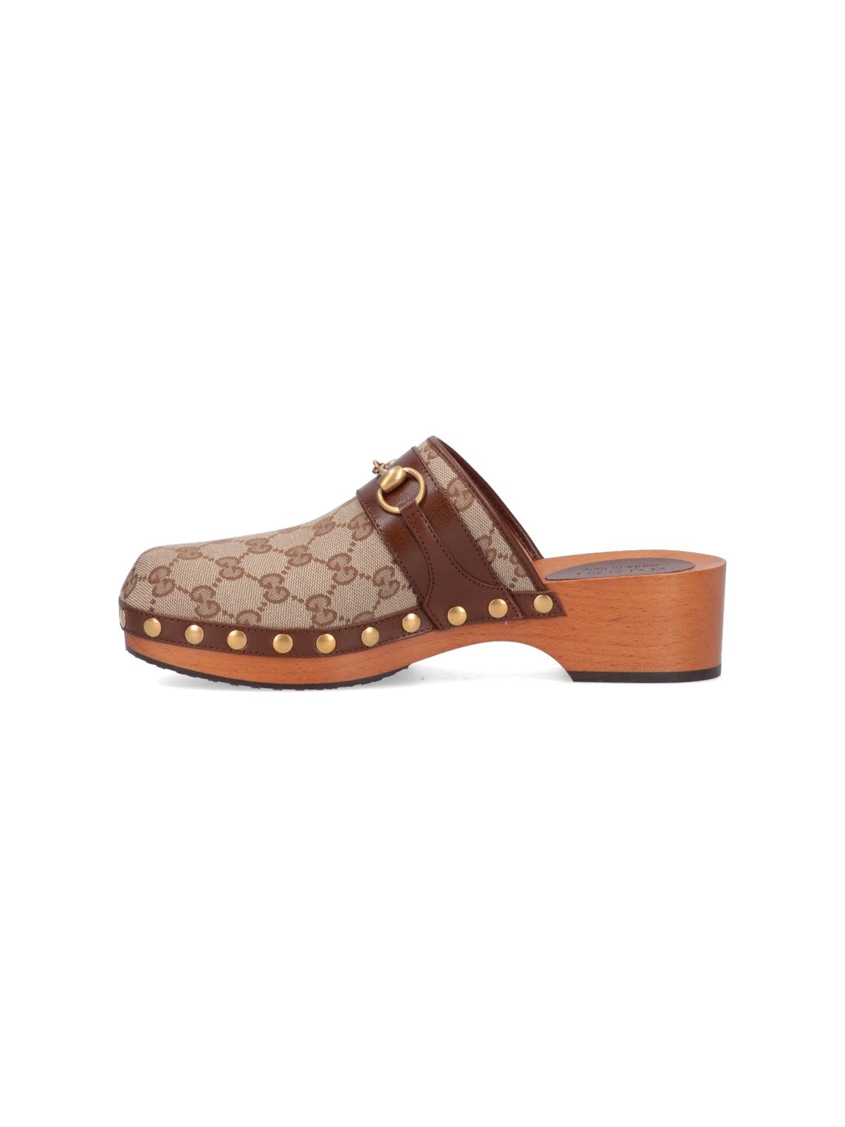 Zoccoli "GG" Gucci, in tessuto GG, colore beige, dettagli in pelle colore marrone, finiture metalliche color oro, punta rotonda.