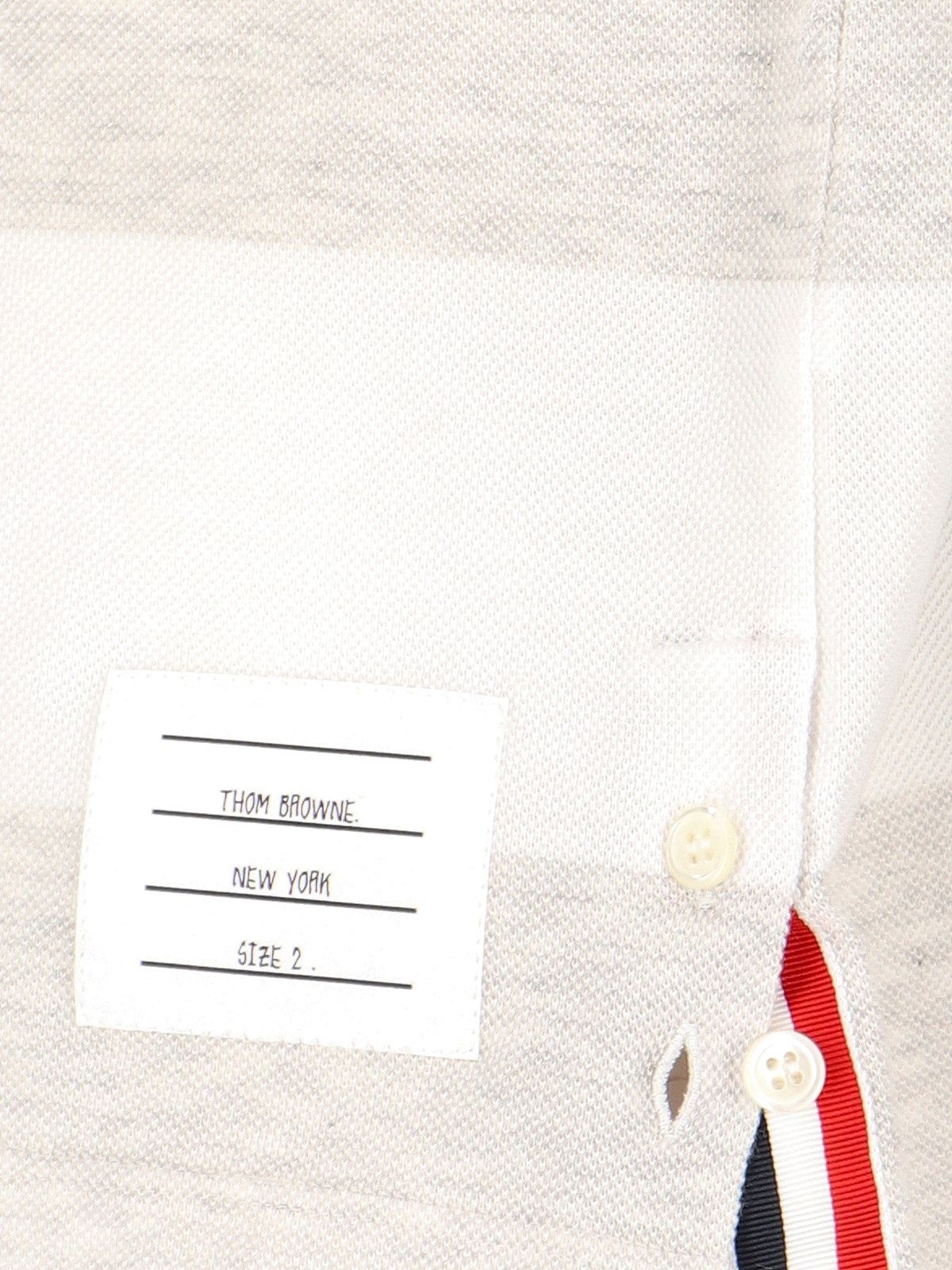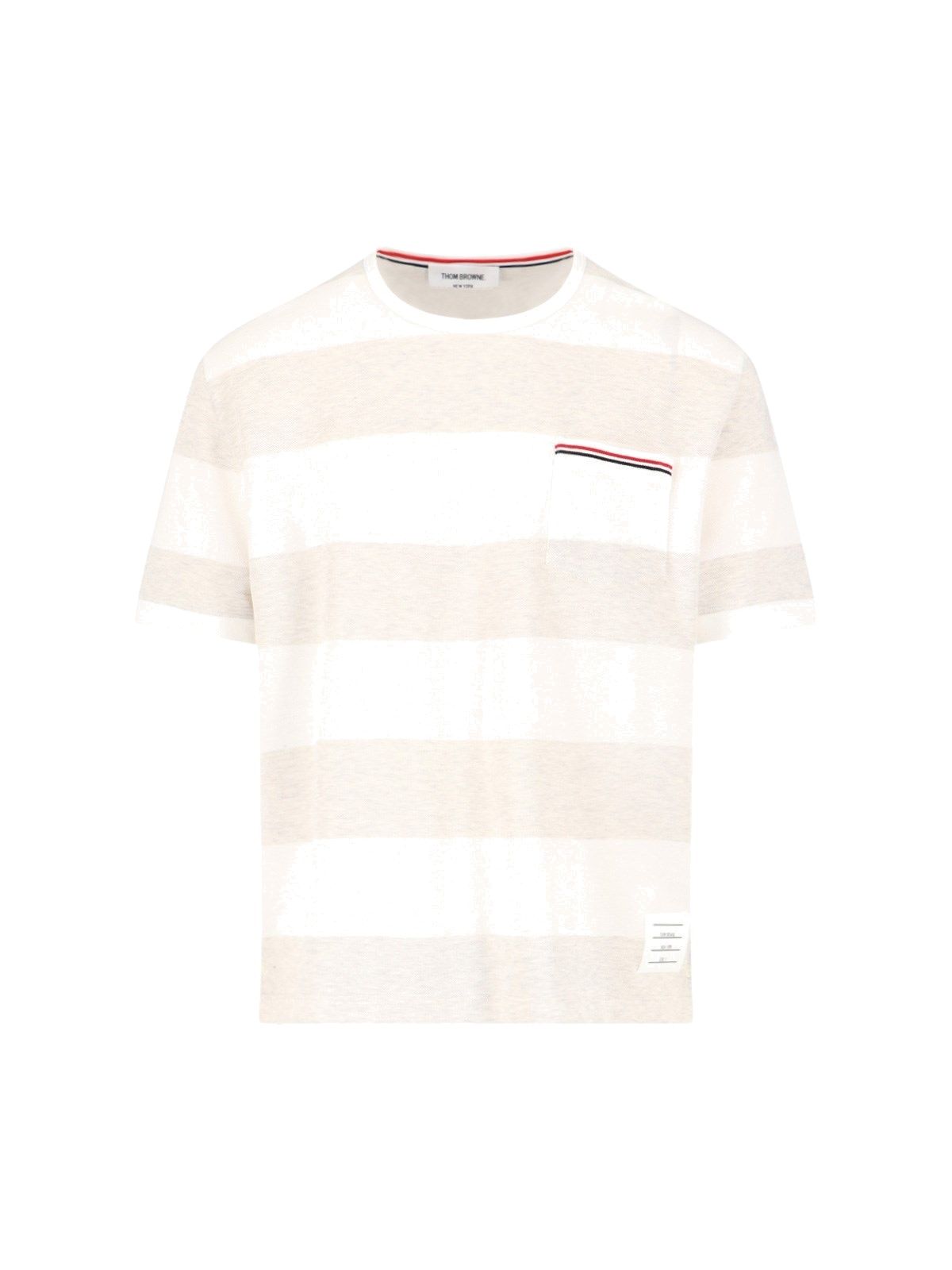 T-shirt "Rugby Stripe" Thom Browne, in cotone pique panna, pattern righe beige, girocollo, maniche corte, taschino dettaglio tricolore petto, etichetta bianca logo su fondo, spacchetti bottoni laterali, linguetta grosgrain tricolore retro, orlo dritto.