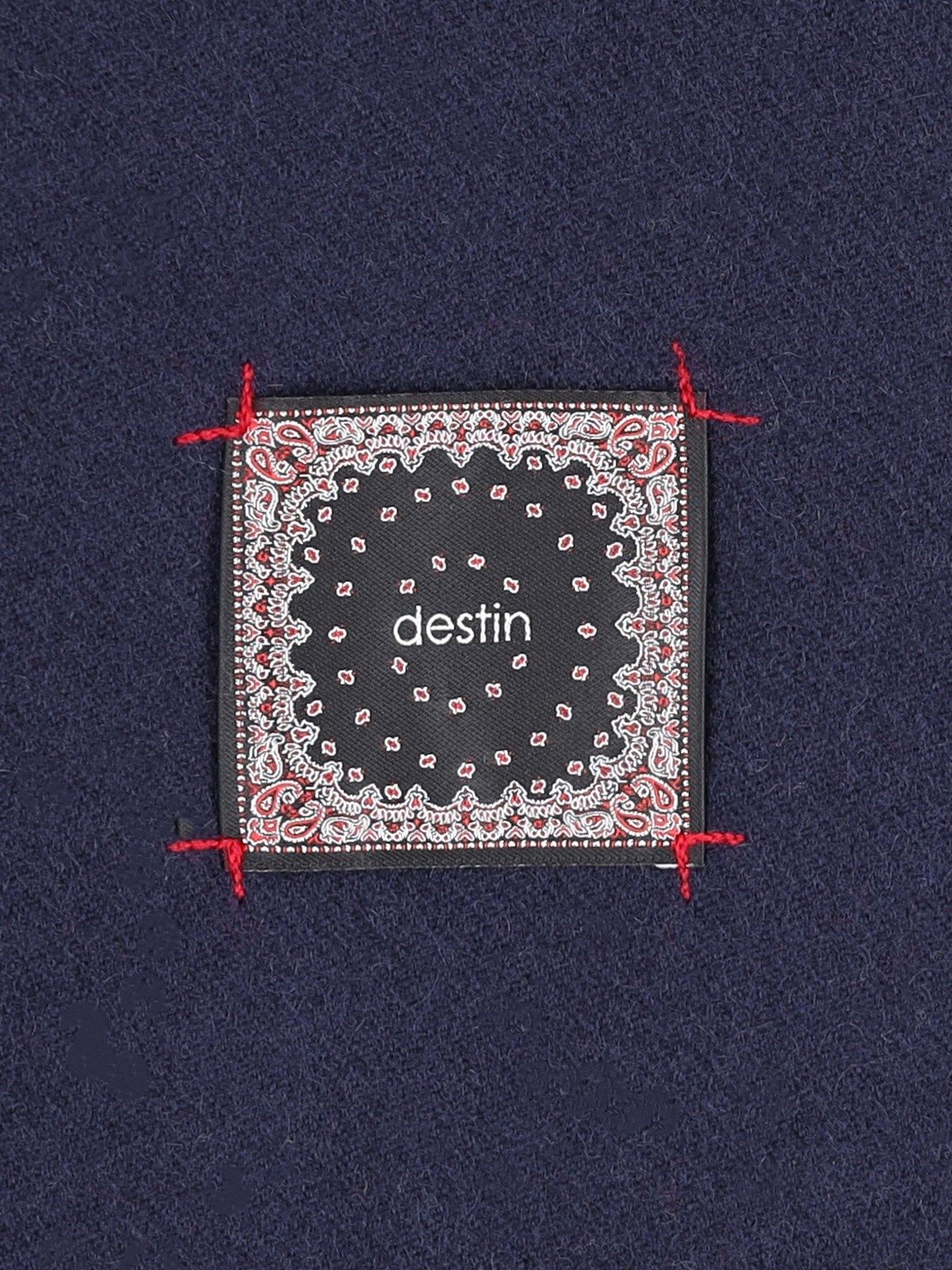 Sciarpa frange Destin, in lana e cashmere, blu, etichetta logo retro, frange su fondo.