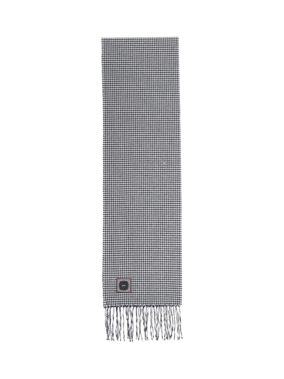 Sciarpa pied de poule Destin, in lana e cashmere, nero, pattern dettagli bianchi, etichetta logo retro, frange su fondo.