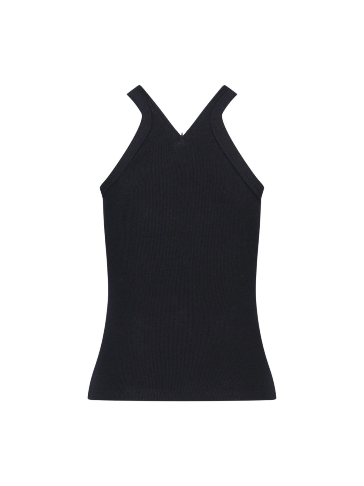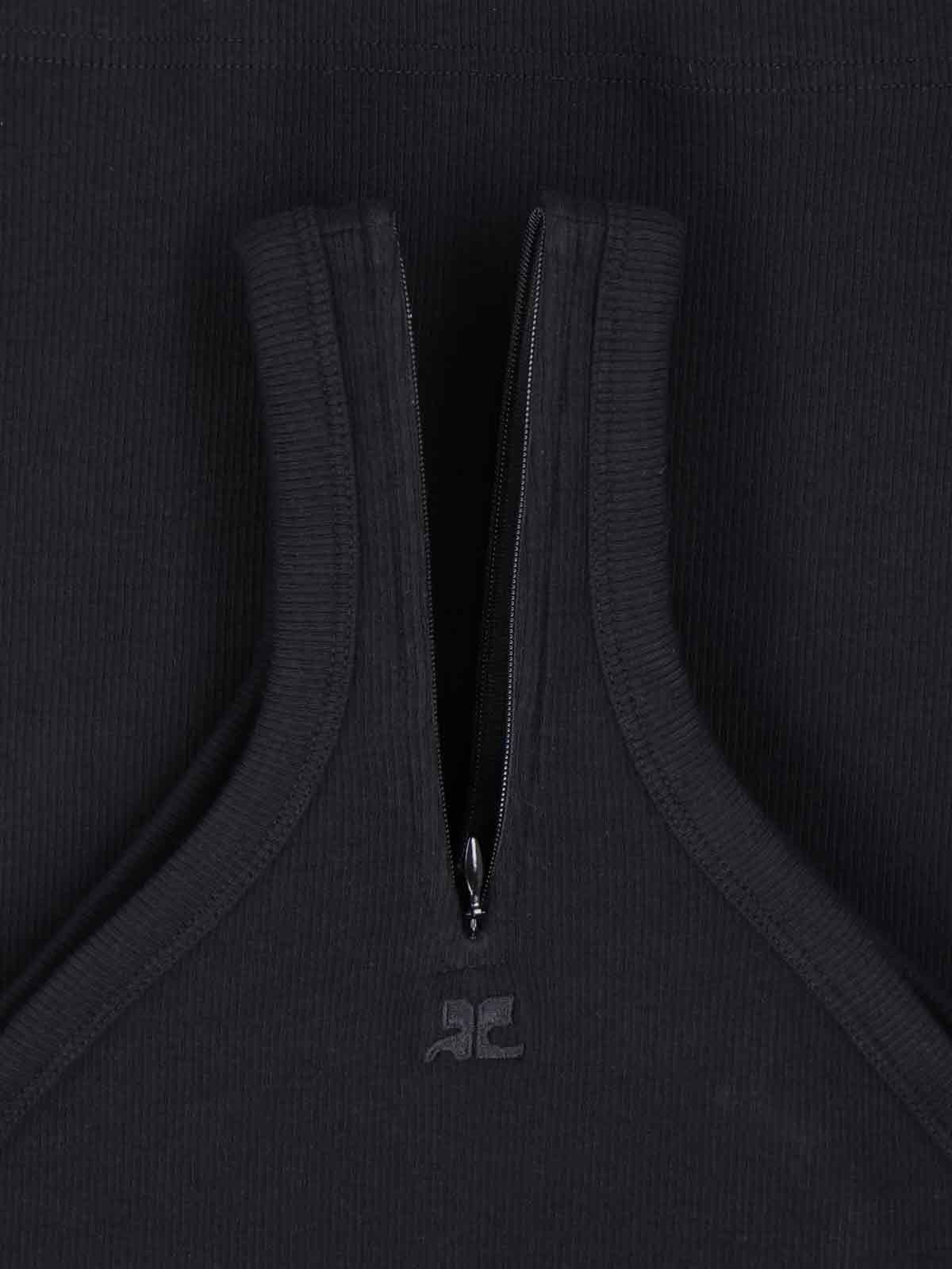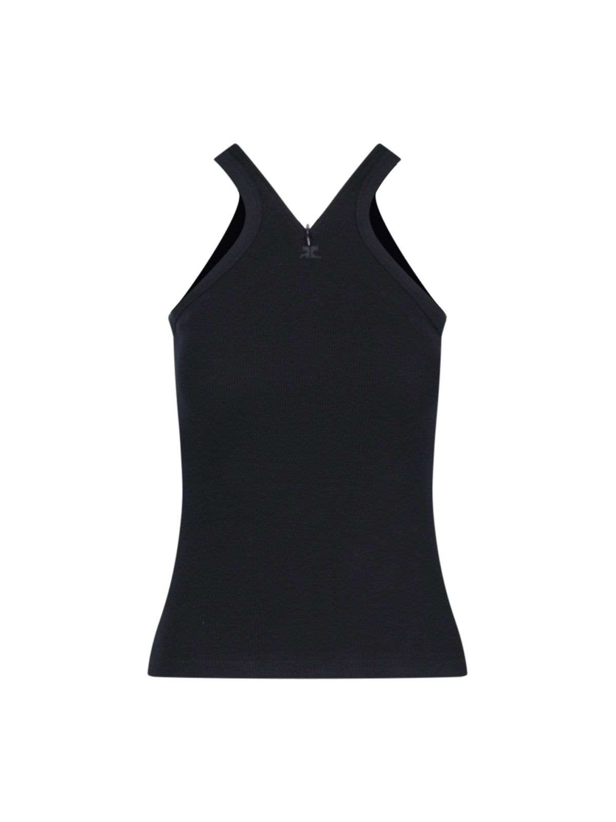 Top logo Courrèges, in cotone elasticizzato nero, lavorazione a coste, scollo a V, dettaglio chiusura zip, senza maniche, spalline sottili, ricamo logo tono su tono fronte, orlo dritto.