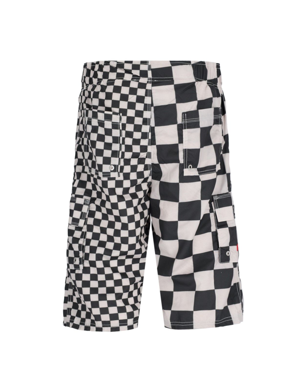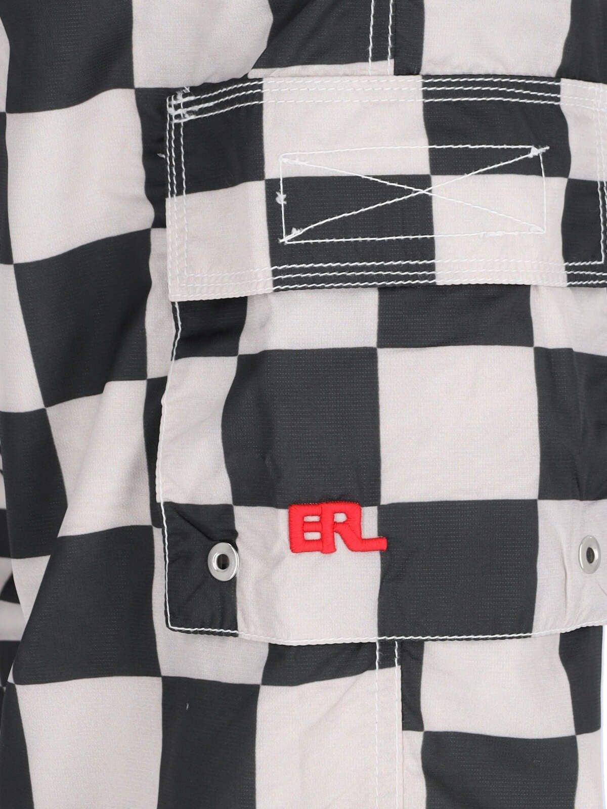 Pantaloncini cargo Erl, in tessuto nero, pattern a quadri bianchi all-over, chiusura lacci, due tasche frontali, due tasche cargo laterali, due tasche applicate retro, gamba dritta.