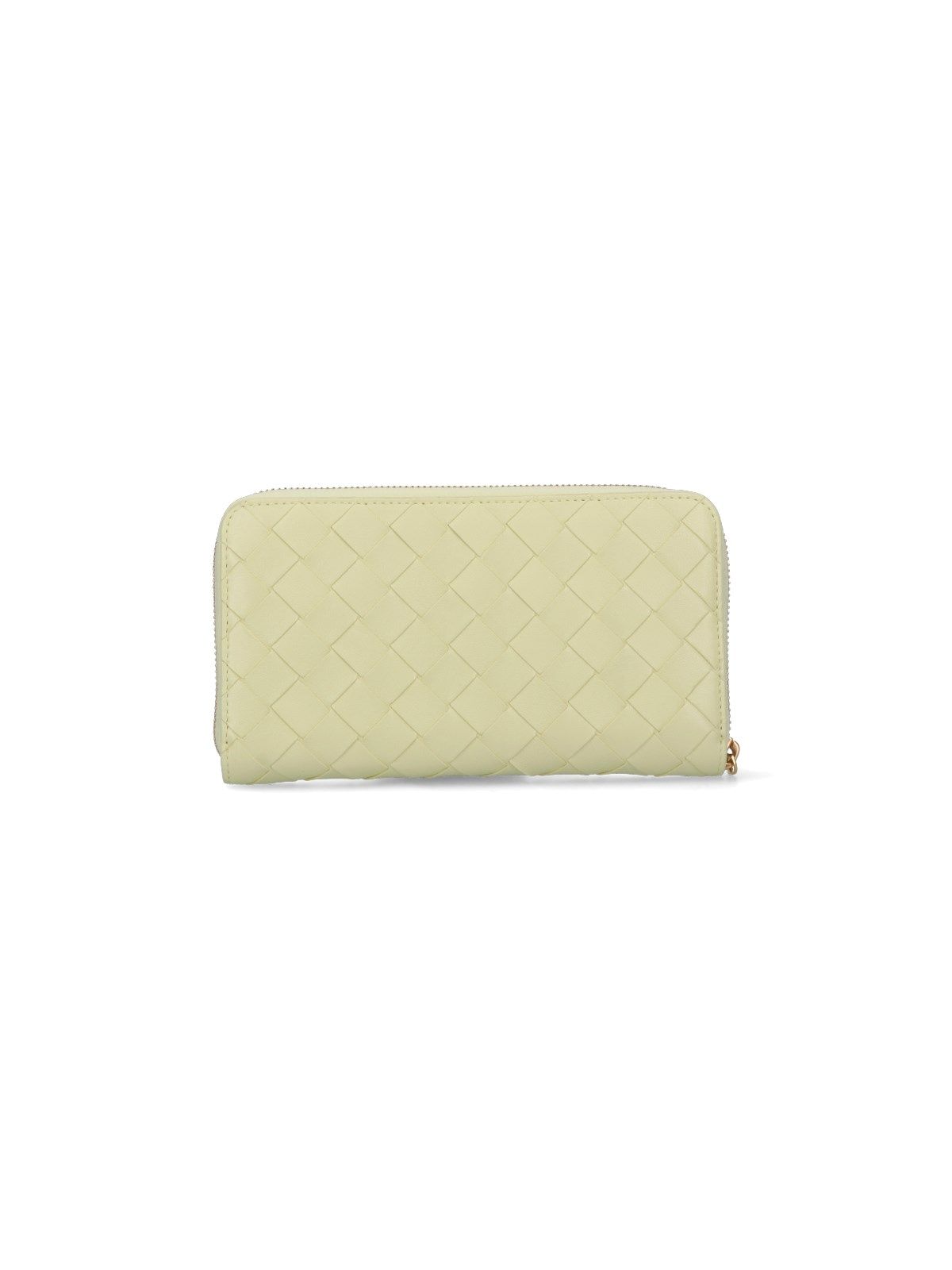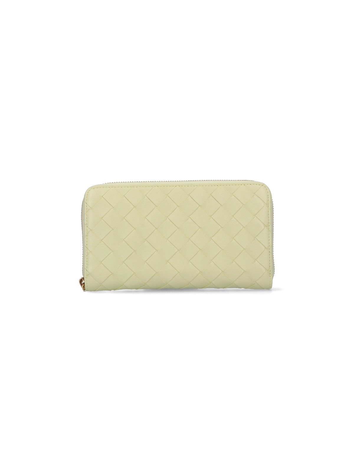 Portafoglio Zip Intrecciato Bottega Veneta, in pelle gialla, iconico motivo intrecciato, chiusura zip, due scomparti banconote interni, due tasche piatte interne, una tasca zip portamonete, otto slot carte.